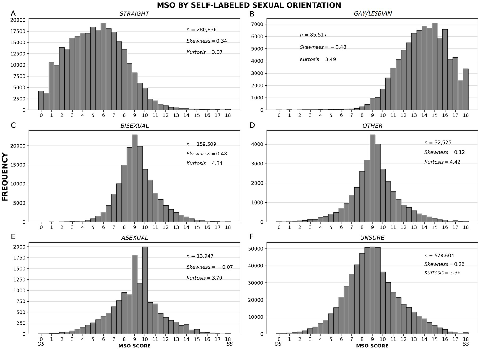 Figure 2. Frequency distributions of MSO scores by self-labeled sexual orientation. Separate distributions are shown for people self-labeled as follows: straight, gay/lesbian, bisexual, other, asexual, and unsure (A–F). If discrete categories were sufficient to define SO, we would see non-overlapping distributions. Instead, each SO label corresponds to a broad, skewed distribution, meaning (a) that the labels do not describe discrete categories, and (b) that there is often a mismatch between the label people use to describe their SO and their actual sexual attractions, fantasies, and behaviors.
