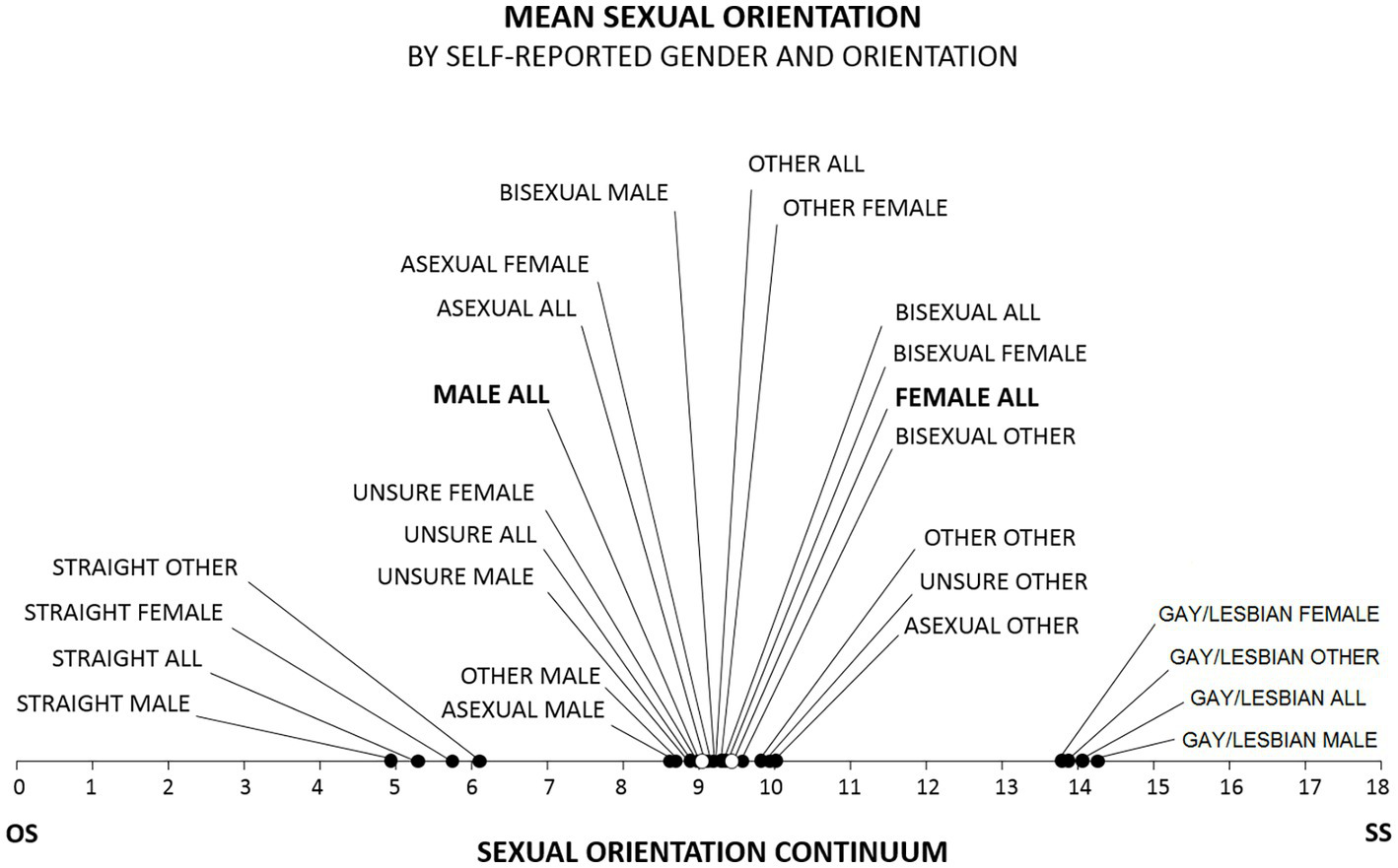 Figure 3. Mean MSO scores for self-labeled gender and orientation. Consistent with the generally understood meanings of the labels, MSO scores for self-labeled gays/lesbians clustered toward the SS end of the SO continuum; scores for self-labeled asexuals, self-labeled bisexuals, self-labeled others, and self-labeled unsures clustered toward the center; and scores for self-labeled straights clustered toward the OS end. In addition, the mean MSO score for females was significantly higher than the mean MSO score for males.