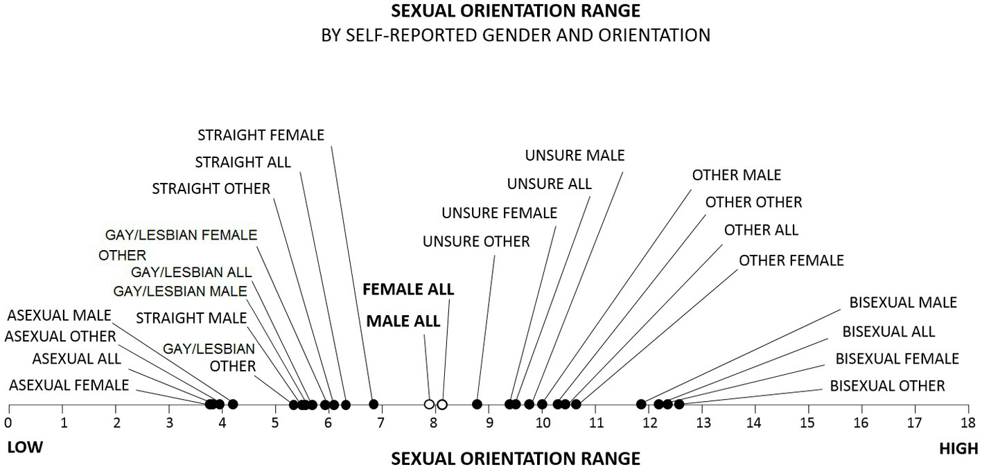 Sexual orientation, however, is still largely viewed as a categorical phenomenon. It has been 75 years since Alfred Kinsey and his colleagues first published their groundbreaking book on sexual behavior (Kinsey et al., 1948), yet their insights into the continuous and somewhat dynamic nature of sexual orientation (SO) are still not widely accepted (Drucker, 2010). Based on interviews with more than 6,000 people, Kinsey and colleagues concluded that “It is a fundamental of taxonomy that nature rarely deals with discrete categories…. The living world is a continuum in each and every one of its aspects” (Kinsey et al., 1948), and this view was echoed in 2008 in a public statement endorsed by the American Psychological Association and 12 other professional organizations (Just the Facts Coalition, 2008). Nevertheless, many people still generally assume that someone is either “straight,” “gay,” “lesbian,” or, perhaps, “bisexual,” (Bailey et al., 2016) with the vast majority of people adopting the most socially accepted of these labels – “straight,” no matter what their actual sexual inclinations (Bostwick et al., 2010; Herbenick et al., 2010, 2017; Joloza et al., 2010; Epstein et al., 2012; Ward et al., 2014; Copen et al., 2016). Because continuous phenomena do not lend themselves to categorical labeling, it has lately become popular to invent more and more labels describing subtle differences in sexual orientation and gender; we are aware of 36 different sexual orientation labels at this writing (Zambon, 2022; cf. Polestar LGBT+ Community Center, 2018).