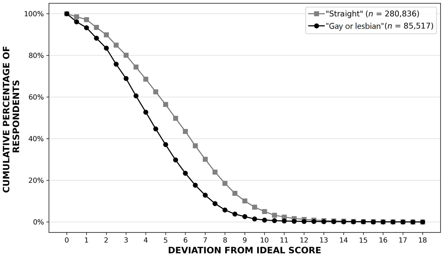 The mismatch between SO labels and MSO scores can be represented by deviation curves as shown in Figure 5. These curves show the cumulative percentages of people self-labeled gay/lesbian and straight who deviated from their expected MSO scores (0 for self-labeled straights, 18 for self-labeled gays/lesbians) by a range of distances on the SO continuum. The deviation patterns for self-labeled gays/lesbians and straights were similar, but deviation levels were higher for self-labeled straights. Overall, about 60% of our participants deviated from their expected MSO scores by four points or more on the 19-point continuum, about 22% by seven points or more, and about 6% by nine points or more.