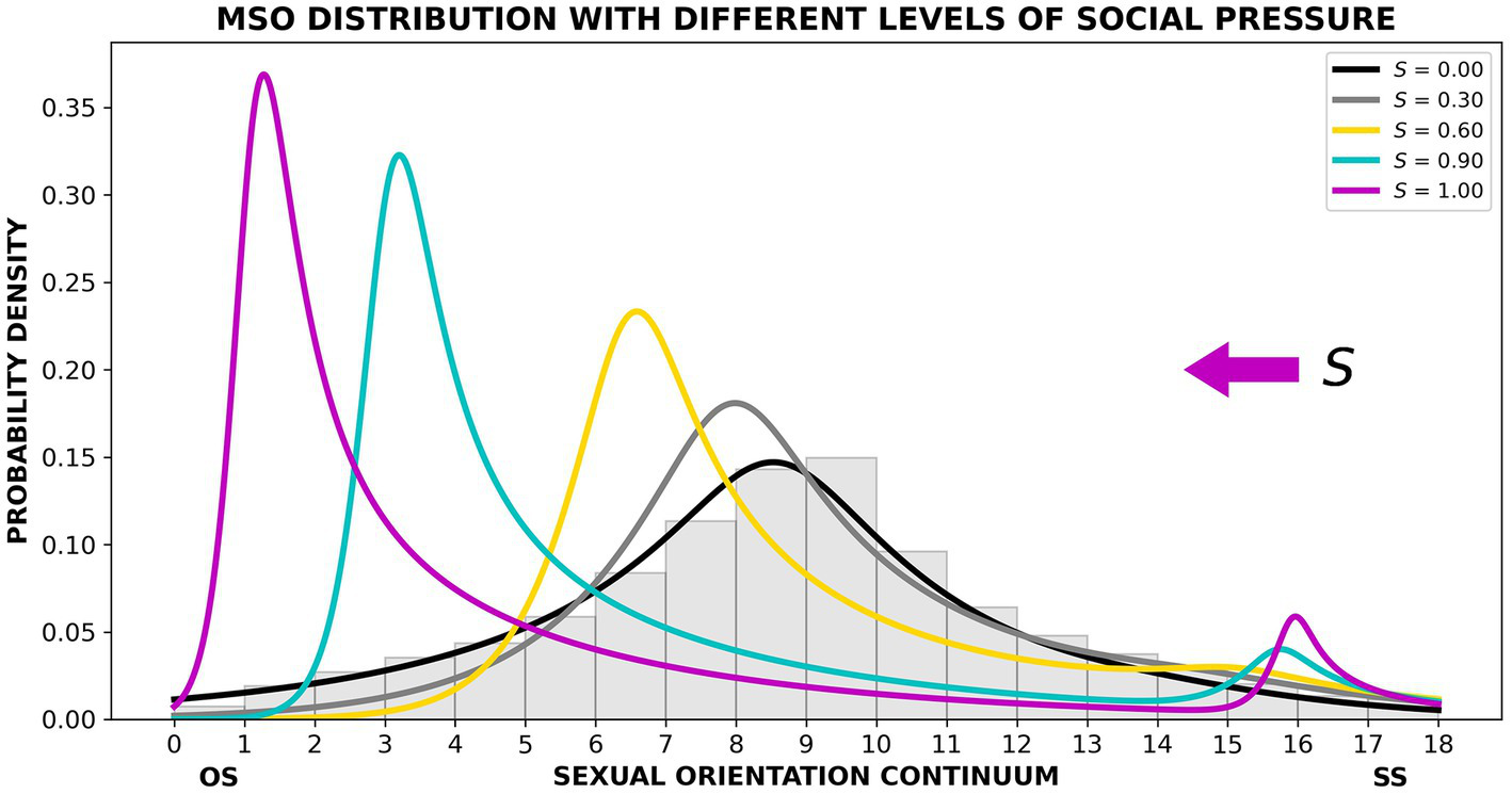 A mathematical representation of this theory is delineated in Supplementary materials. This model contains no free parameters; all parameters were calculated from the dataset we have presented in this study. According to SPT, the MSO distribution results from a linear combination of two sinh-arcsinh distributions (Kokoska and Zwillinger, 2000; Jones and Pewsey, 2009) at certain mixture rates; the separate distributions represent independent SS and non-SS sexual inclinations. Figure 6 shows how the MSO distribution becomes increasingly distorted as social pressure (S) increases (also see Supplementary Figure S3). Although social pressure in the modern world almost universally pushes the curve toward the OS end of the continuum, the model suggests that pressure toward the SS end of the continuum will produce symmetrical changes in that direction. The vision of a world in which only SS inclinations are acceptable – in some instances as a means of limiting population growth – has been explored over the last 50 years in a number of short stories, books, and movies (e.g., Haldeman, 1974; Grugman, 2008; Beier, 2012; Preble, 2013; Budd, 2016; Love is All You Need, 2016). The predictive and symmetrical nature of the theory can be explored using a computational implementation of the SPT equations, written in Python.2