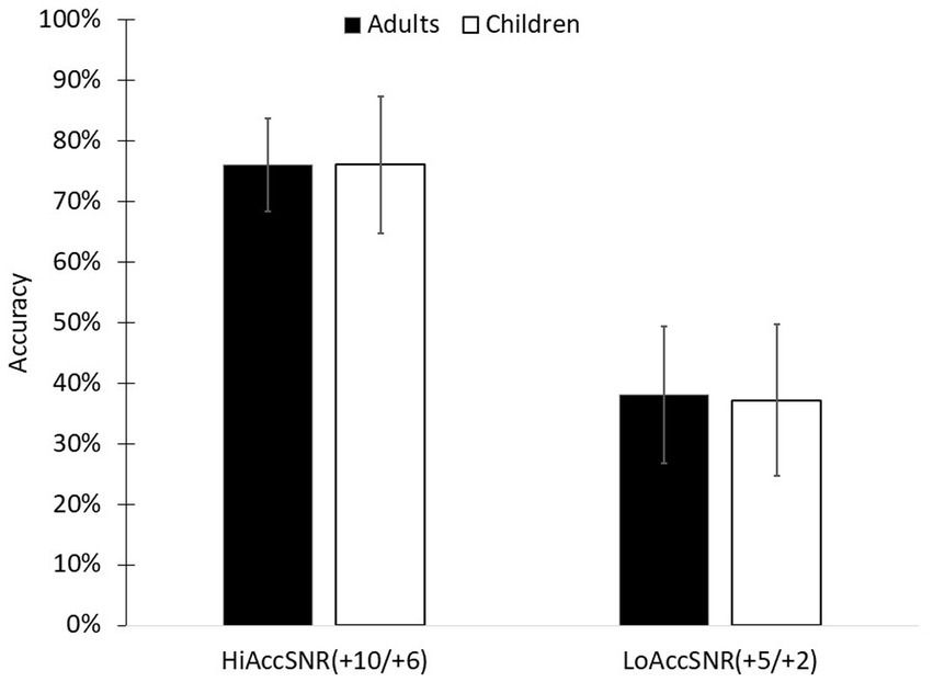 Accuracy rates among children and adults for high and low accuracy SNRs HiAccSNR = High Accuracy Signal to Noise Ratio (+10 dB/+6 dB); LoAccSNR = Low Accuracy Signal to Noise Ratio (+5 dB/+2 dB).