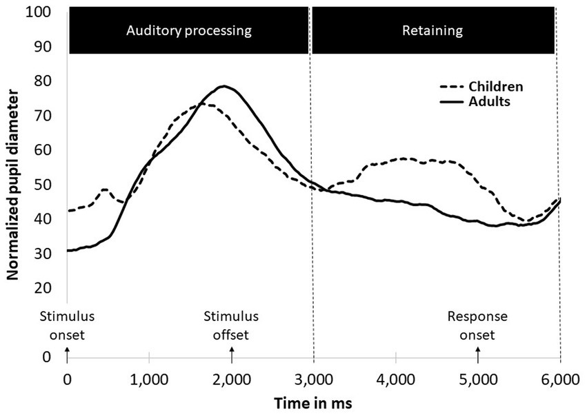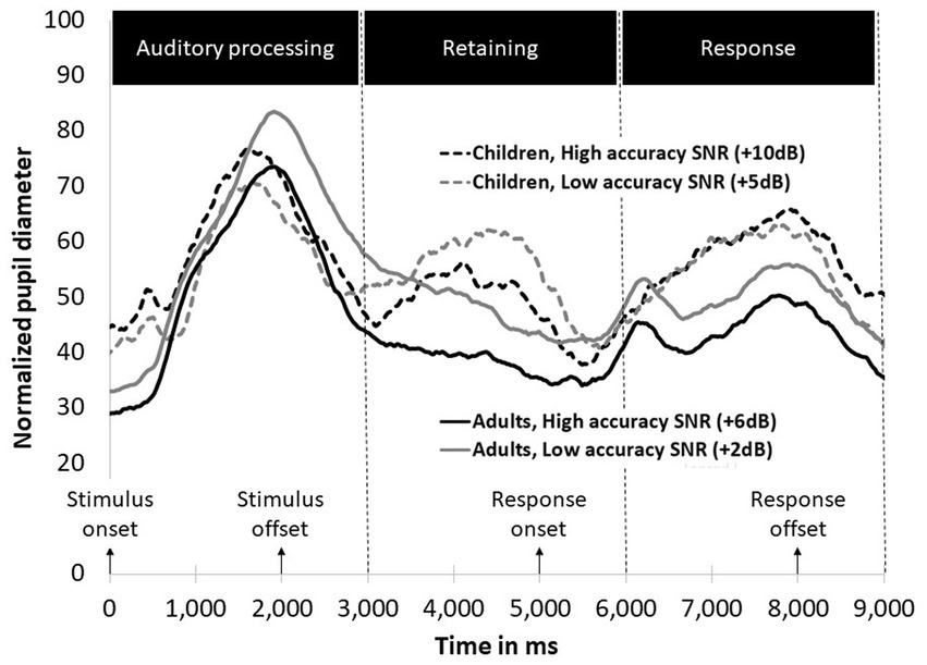 During the auditory processing phase, both groups displayed pupil dilation; however, adults exhibited greater dilation than children, particularly in the low accuracy condition. In the second phase (retention), only children demonstrated increased pupil dilation, whereas adults consistently exhibited a decrease in pupil size. Additionally, the children’s group showed increased pupil dilation during the response phase.