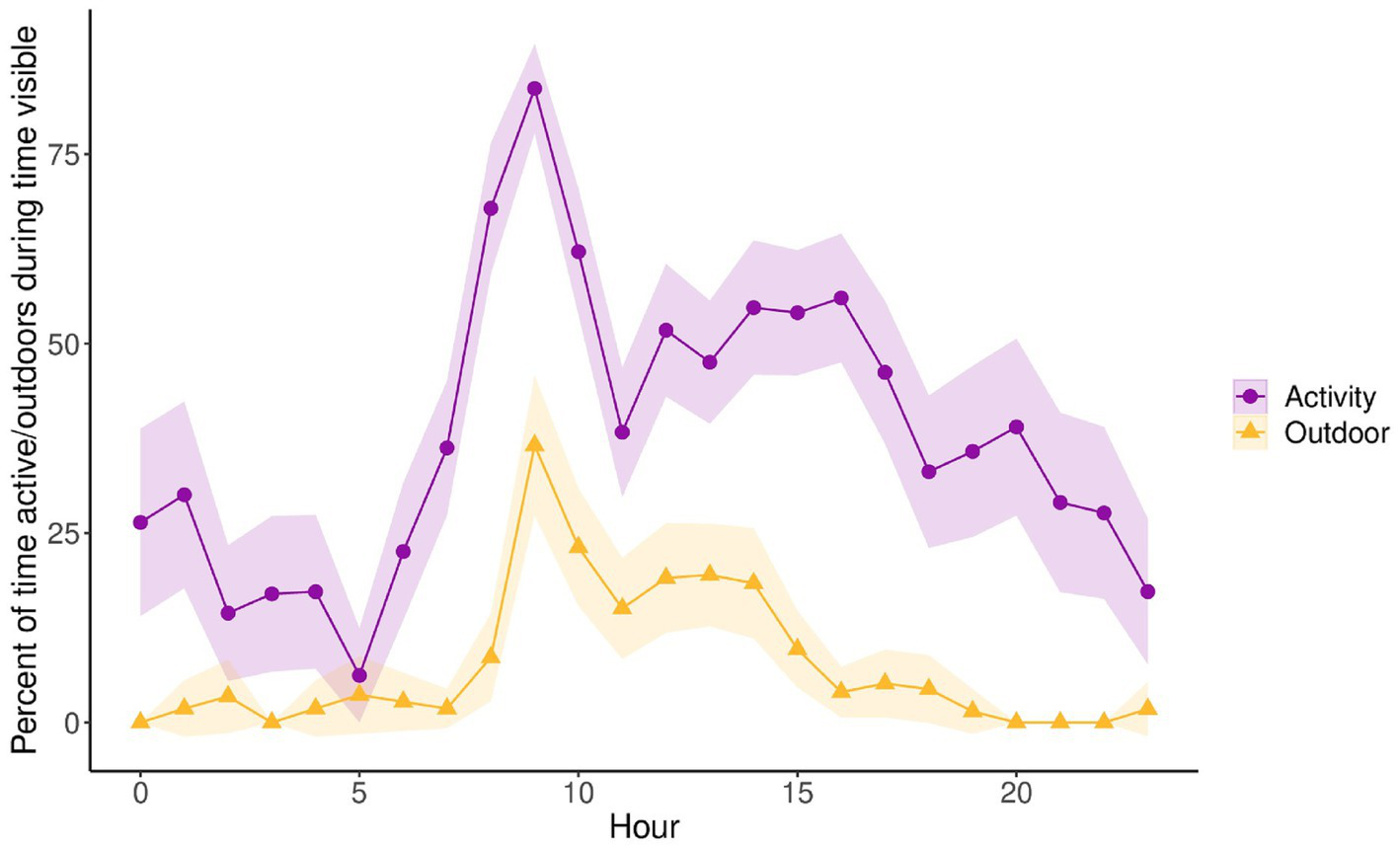 Within the count model, the negative coefficients for temperature minimum (−0.007, z = −1.970, p = 0.049) and temperature range (−0.014, z = −2.955, p = 0.003) suggest a decrease in activity with an increase in both the temperature minimum and temperature range for the day. The trend toward significance for the positive coefficient for daylight (0.017, z = 1.828, p = 0.068) indicates a potential, slight increase in activity with an increase in amount of daylight. A trend toward significance was also seen for activity at mismatched latitudes (−0.139, z = −1.834, p = 0.067) and could suggest a potential, slight decrease in activity at mismatched latitudes compared to activity displayed at matched latitudes.
