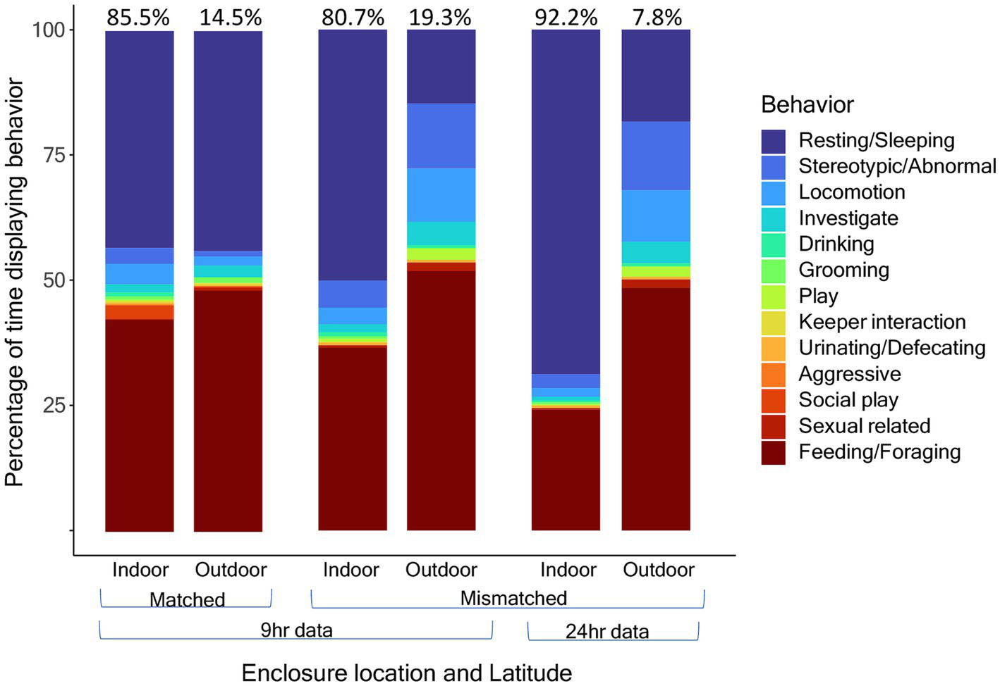 Most captive animals have both indoor and outdoor enclosures. Zeitgebers tend to be controlled for indoor enclosures (i.e., temperature and artificial lighting). However, for outdoor enclosures, the zeitgebers are those for the latitude which the zoo is located. Because of this, we wanted to examine how time outdoors is associated with activity levels. To provide more context to this relationship, we determined the activity budgets while indoors versus outdoors and looked at the difference between the latitude groups since pandas at mismatched latitudes would presumably experience outdoor external factors for which they are not adapted to. We conducted Welch’s paired sample t-tests to compare the levels of locomotion, resting/sleeping, feeding, and stereotypic/abnormal behavior between the indoor and outdoor enclosures within each latitude category (matched/mismatched).