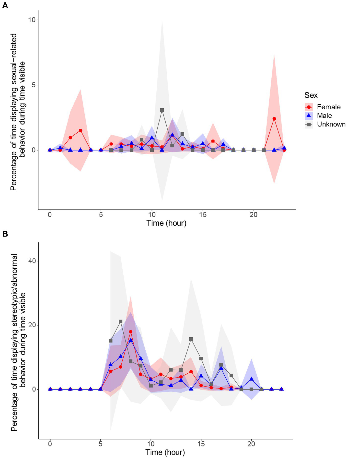 To demonstrate this holistic approach and to investigate climatic/latitudinal effects on captive animal behavior, we are investigating the circadian and circannual cycles of captive giant pandas as a case study. Giant pandas have a historic natural latitudinal range of 26°N-42°N (Loucks et al., 2001). They are seasonal breeders mating between March and April (Liu et al., 2002). Females have a single, annual estrus period with mating receptivity lasting only 1–3 days (Schaller, 1985). The mating strategies involve females and males synchronizing multimodal signaling behavior around the estrus cycle with social/sexual behaviors increasing during this period (Owen et al., 2013) and mate choice increasing the likelihood of successful breeding (Martin-Wintle et al., 2015). Therefore, although hormonal data was not available for this study, we can still demonstrate how understanding the circadian rhythmicity of these sexual-related behaviors can aid zoo staff in identifying when their pandas are receptive for breeding and if behaviors are desynchronized with estrus if zoos then pair the behavioral data with hormonal data.