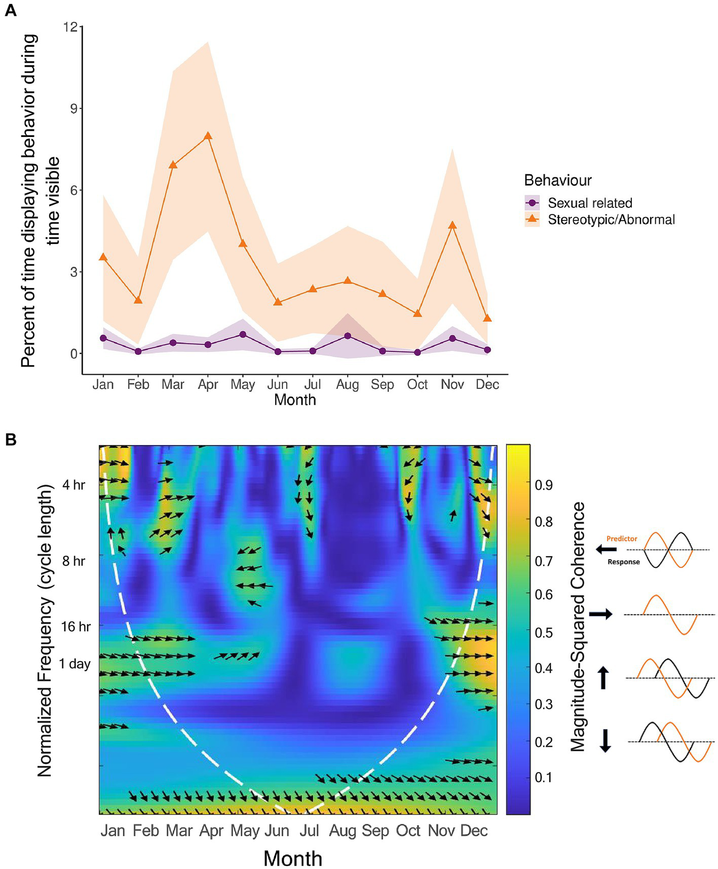 To conduct the analysis, we used the MatLab Wavelet Toolbox developed by Grinsted et al. (2004). Our data are non-stationary, so we used a continuous wavelet analysis with the Morlet wavelet and a scale resolution of 10 scales per octave, as suggested by Grinsted et al. (2004), since these settings provide a good balance between time and frequency localization. Our sampling period was set as Δt = 1 h. We also decided to conduct continuous wavelet transform and wavelet coherence analysis because these analyses were used by Zhang et al. (2017) to address similar questions in wild giant pandas on activity data recorded using radio collars. We followed their analyses as closely as possible so that our data could be compared to the results found in wild pandas. However, because of our sampling method, our behavior signals are constructed of consecutive, representative 24 h periods in each month. Therefore, we could only determine the patterns of circadian cycles and the annual cycle of those circadian cycles but could not infer anything about rhythms with a month-long period.