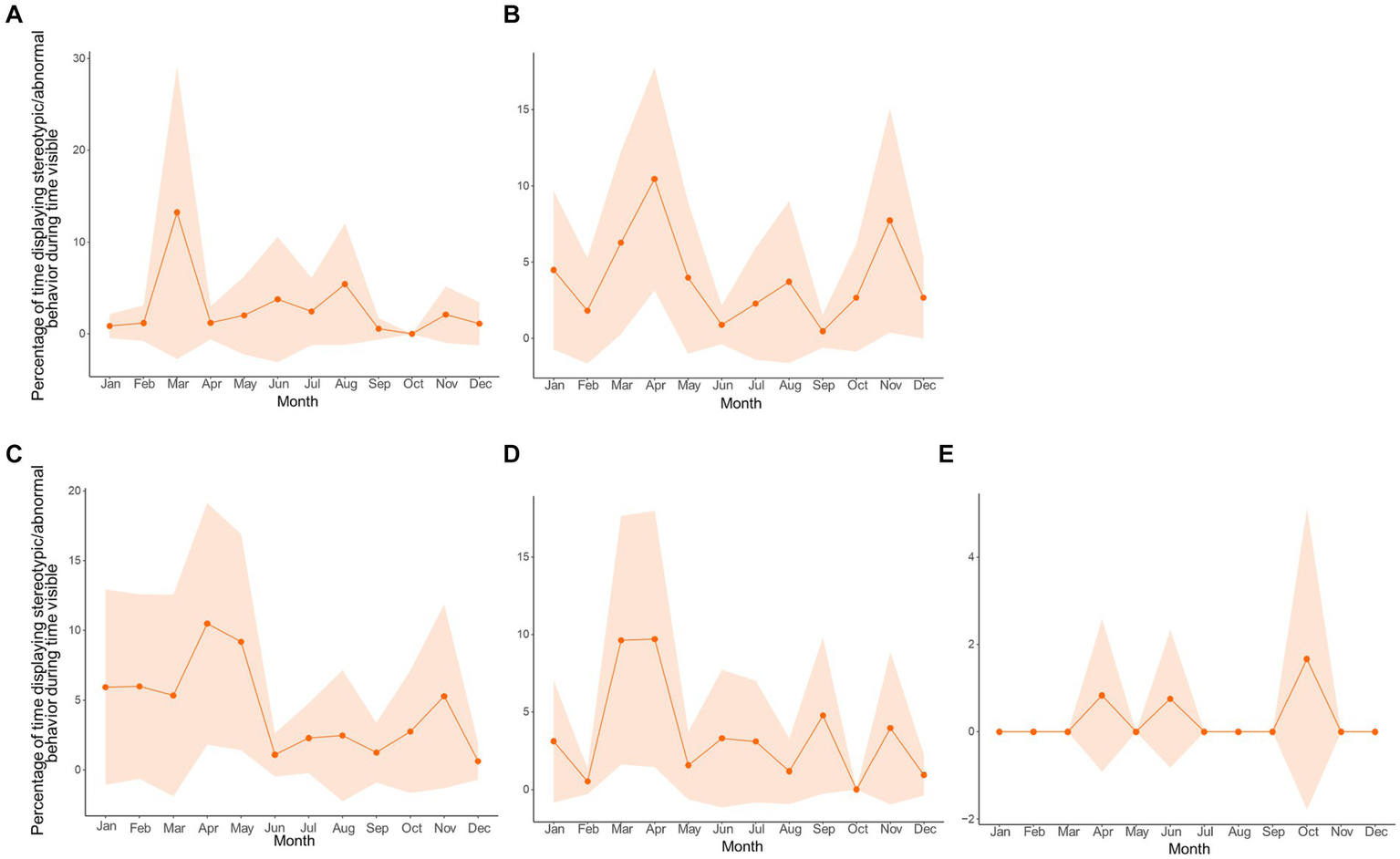 | Stereotypic/Abnormal | Pace, bipedal standing, self-mutilation, cage climb, regurgitation, pirouette, and head-toss. |
