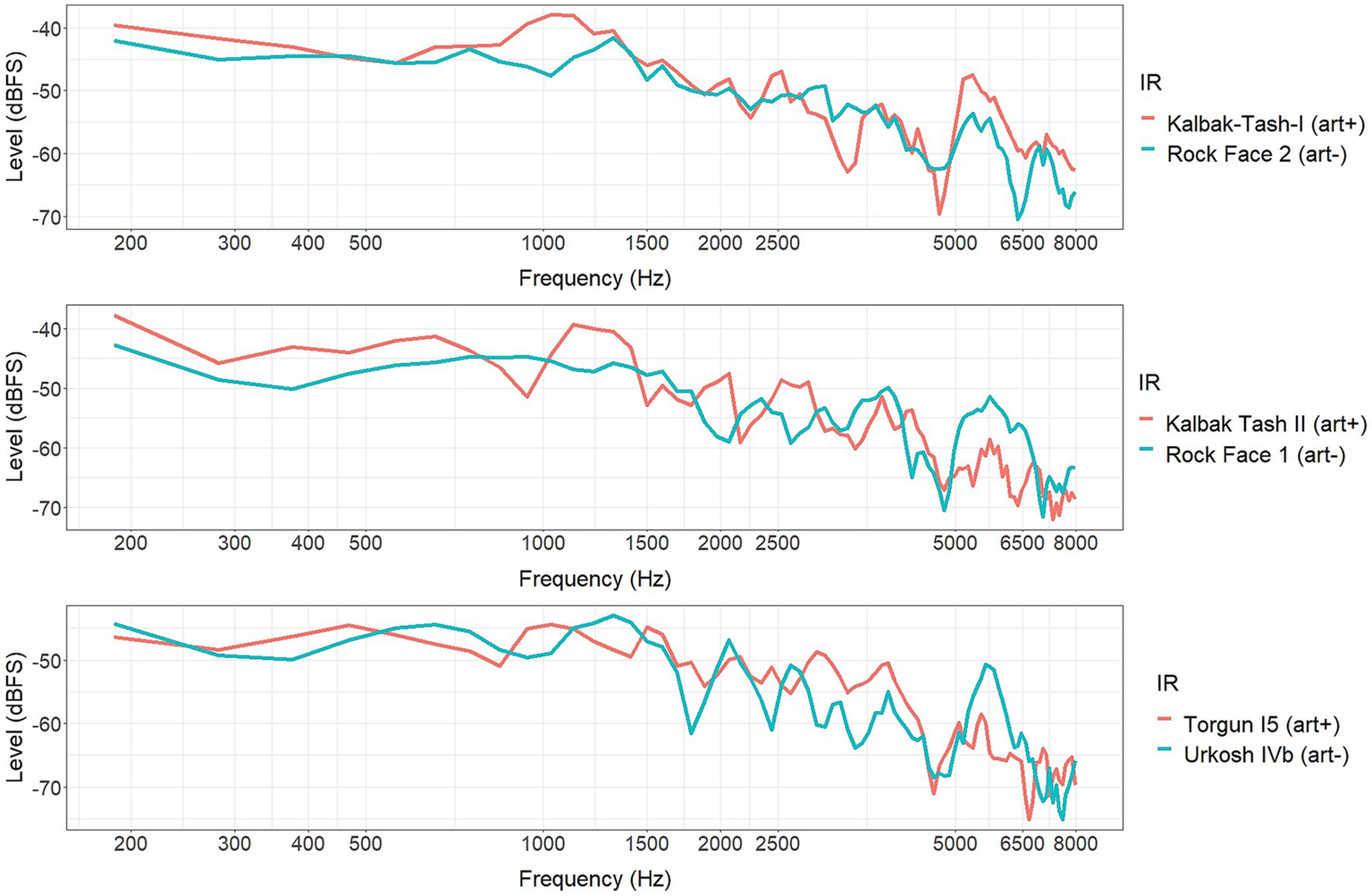 A second limitation relates to the nature of the actual stimulus sets used in the present experiment. In order to reproduce a soundscape accurately, the sounds employed in the convolutions must be anechoic or quasi-anechoic (Farina and Ayalon, 2003). In the present study, anechoic recordings from natural Siberian sources, such as animals, were impossible to record, but a quasi-anechoic version may be obtained by the deconvolution of the recorded sound with the IR from the place where it was recorded (Gemba, 2014). This approach should also be considered in further research, particularly when natural sounds are employed. For these reasons, the sounds obtained from the convolutions might not be a completely accurate representation of the soundscapes in the moment when rock art was produced, and this must be taken into account when extracting conclusions regarding the possible reasons why these places, and not others, were decorated.
