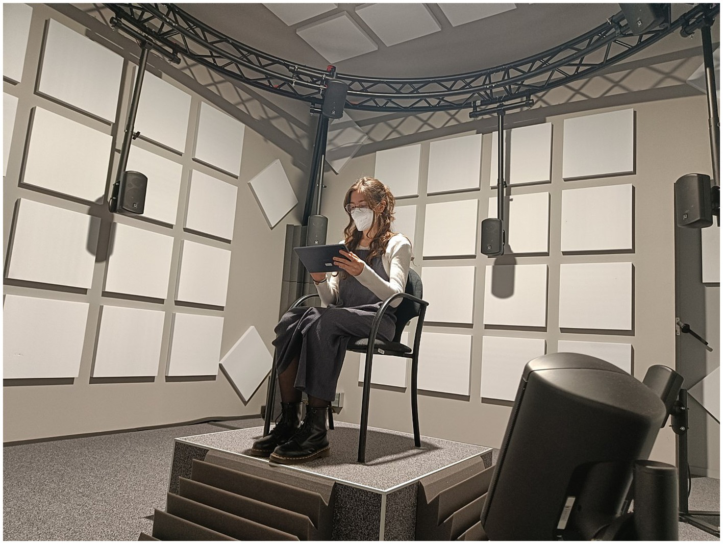The experiment was carried out in the Immersive Psychoacoustics Laboratory (immpaLAB, Figure 6), located in the Faculty of Psychology of the University of Barcelona (Spain). This facility, consists of a control room and a soundproofed chamber. The latter has a 16 loudspeakers array, disposed in a 3D sphere and equidistant from the participant’s head, that allow rendering sound in third order Ambisonics format. Experiment participants were asked to sit in the center of the soundproofed chamber.