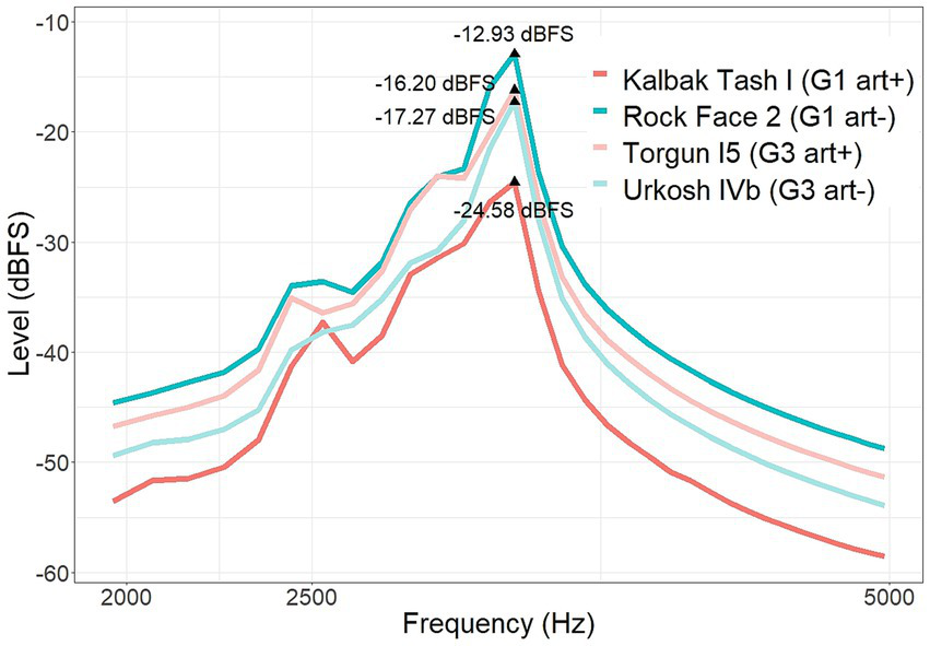 The results revealed by the analysis of the ratings of tension for each sound separately, in the case of the sounds of snow and waterfall seem consistent with this argument. However, we observed an odd behavior of the results of the sound of plover. While the third group reported feeling greater tension when listening to this sound convolved with the art+ IR from the panel of Torgun I5, in line with the results described so far, the first group reported the opposite: feeling greater tension when listening to the art− version of the sound. If we observe the spectral density of this sound convolved with each IR from bundles 1 and 3 (see Figure 10), the amplitude at the peak frequency of 3,188 Hz is 1.08 dB greater in the art+ version of the third bundle (convolved with the IR from the rock art panel of Torgun I5) compared to its corresponding art− IR. This difference is short but above the JND (Long, 2014). Nevertheless, in the case of the first bundle, the opposite happens: amplitude of the frequency peak at 3188 Hz is 11.65 dB greater in the art− version of the sound than in the corresponding art+ (convolved with the IR from the rock art panel of Kalbak Tash I). As we stated previously, tension-like feelings are directly related with loudness (Granot and Eitan, 2011; Ministère de la Santé et des Services sociaux, 2016) and this relation is especially prominent when sounds are characterized by high frequencies (Ilie and Thompson, 2006; Juslin and Västfjäll, 2008; Granot and Eitan, 2011). Thus, in this case, the marked high-frequency peak amplification, especially in the first bundle of IRs, might be masking the slight difference in reverberation, and positioning as the main cue responsible for eliciting greater tension in the art− version of the sound of plover, in participants from the first experimental group. As we have confirmed, this one single result does not influence the general tendency observed when analyzing the effect of the factor art in the tension attributed to all the sounds by participants from the first experimental group.