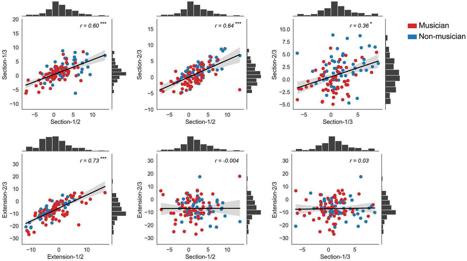 The correlation matrix was presented in Table 2 (Musicians), Table 3 (Non-musicians), and Table 4 (All Participants). Among the section conditions, significant correlations were found between the mean normalized deviations of the bisection condition and the other two trisection conditions for both groups. Regarding the extension conditions, significant correlations were identified through pairwise correlation analyses in both groups. However, between the section conditions and extension conditions, no significant correlations were observed for both groups. The combined results from both musicians and non-musicians were also computed, revealing a similar pattern as shown in Table 3 and illustrated in Figure 3. To mitigate the risk of type I errors associated with multiple comparisons, Bonferroni correction was applied.