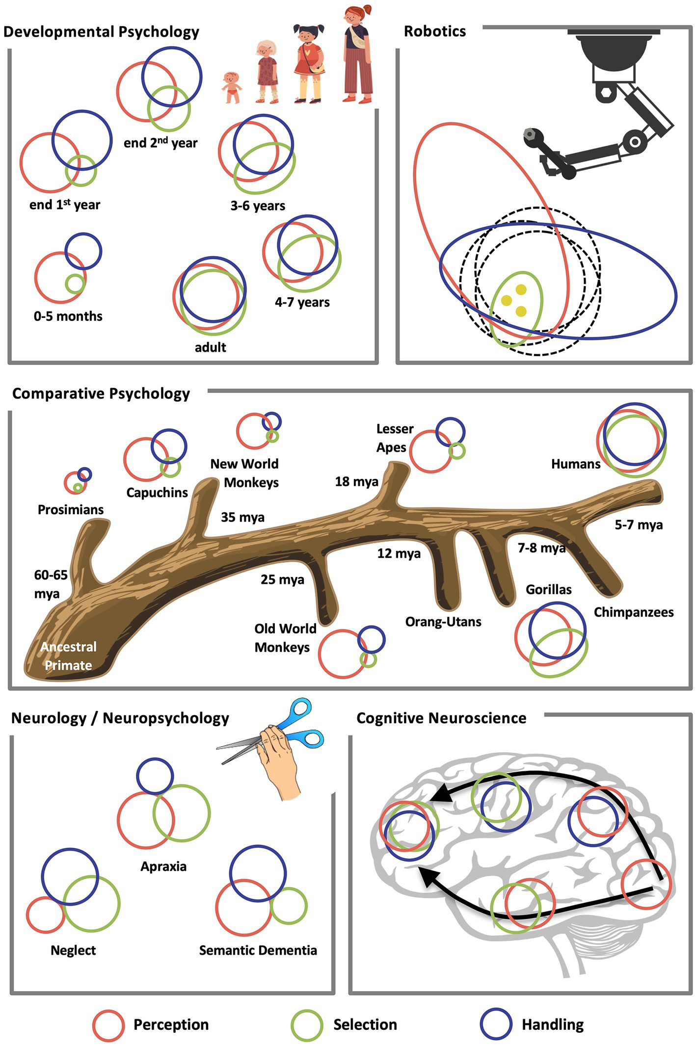 In this review, we will focus on some of the key disciplines in tool use research: The disciplines of developmental and comparative psychology, cognitive neuroscience, neurology, and robotics have so far substantially contributed to our current body of knowledge about tool mastering (Figure 2). In the field of comparative psychology we will concentrate on primates and exclude other animal species (Shumaker et al., 2011; Colbourne et al., 2021), because we set as focus the human being and the human evolution. In the following, a summary of these achievements will be structured according to the three major building blocks of tool mastering.