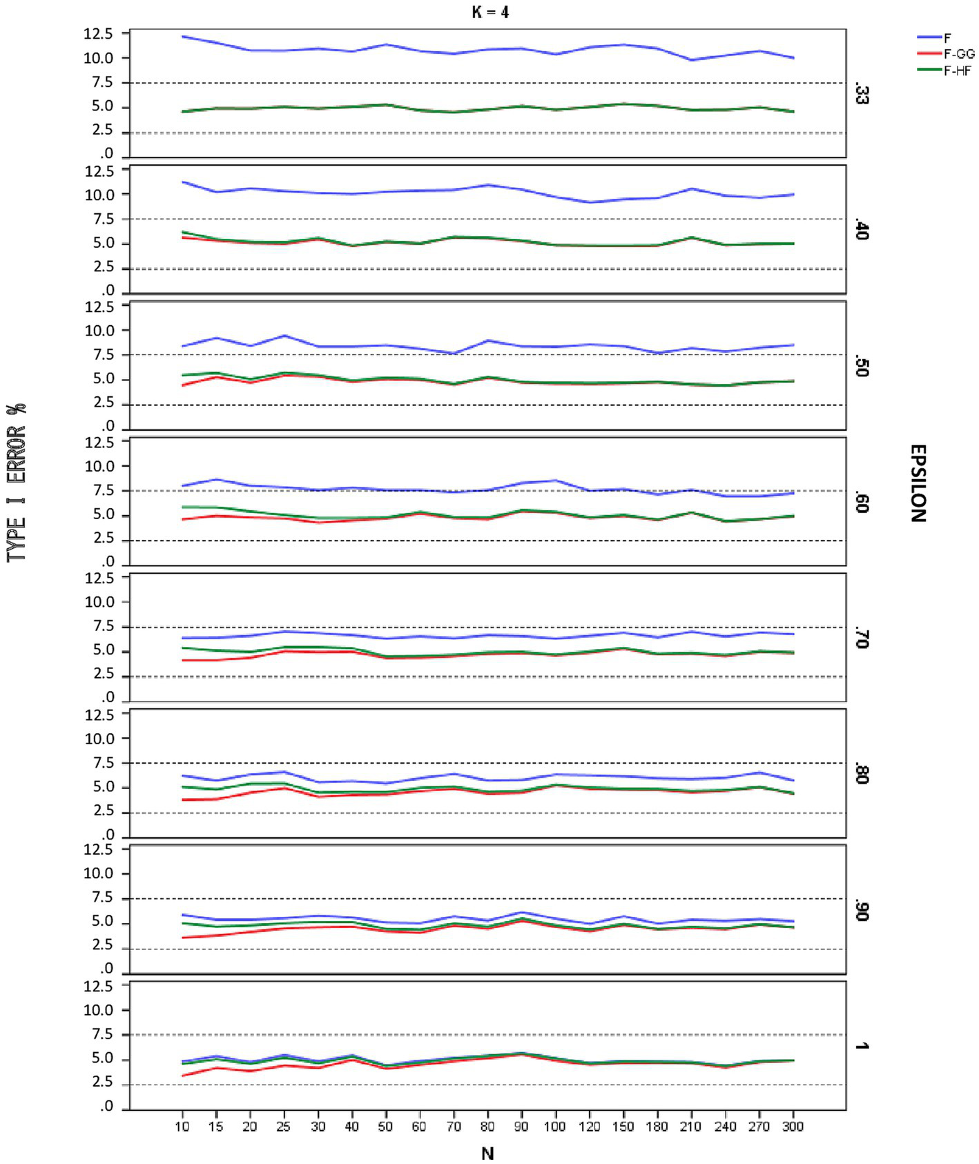 Applying a stricter criterion of robustness is especially useful when F-GG and F-HF yield discrepant results. Based on the results obtained when using Bradley’s (1978) stringent criterion, which ensures that Type I error remains closer to 5%, in the interval [4.5, 5.5], we propose using either F-GG or F-HF, depending on the value. In most statistical packages this estimation of ε is labeled as Greenhouse–Geisser epsilon, and if < 0.60, F-GG should be used, whereas if 0.60 ≤ ≤ 0.90, F-HF should be used.