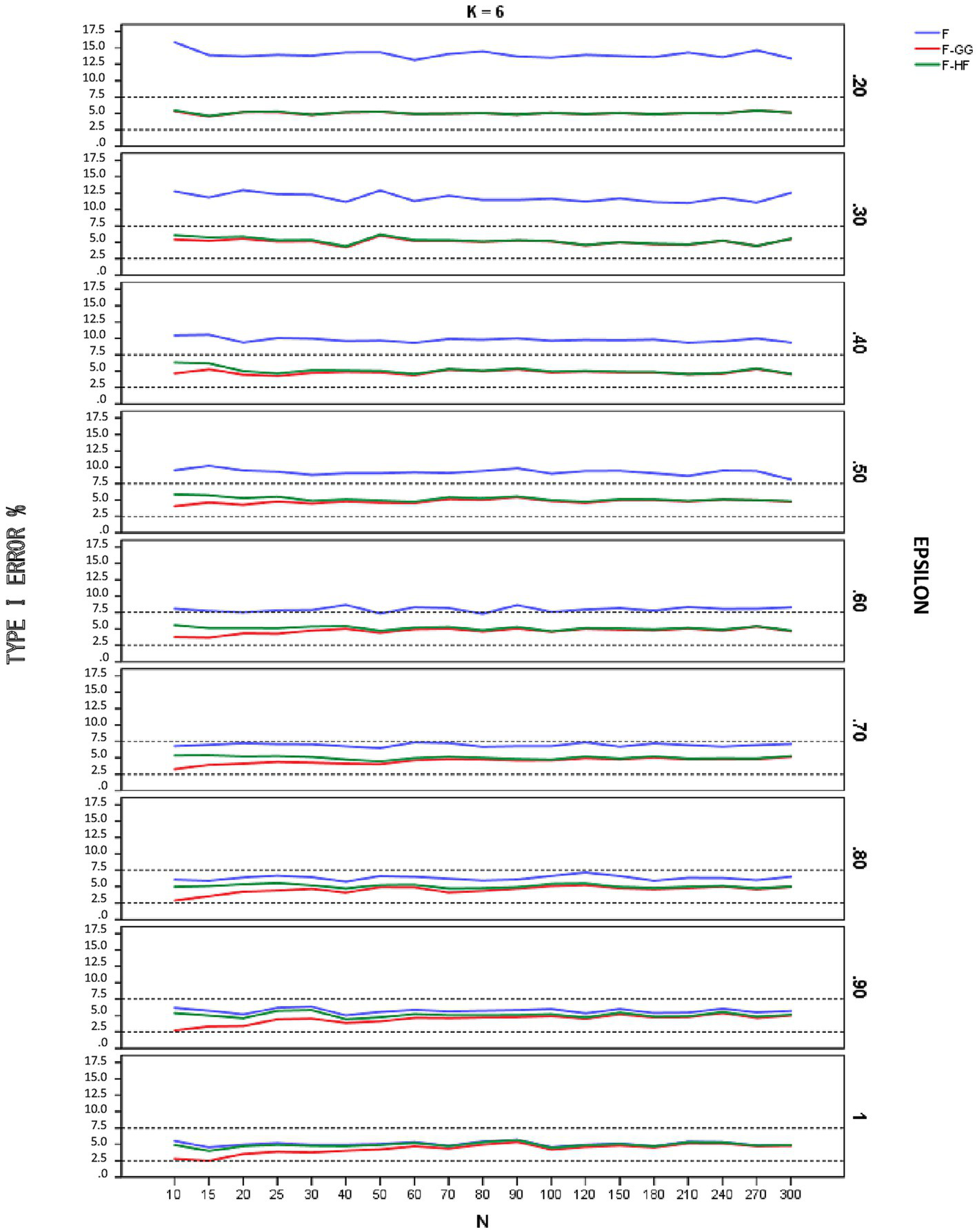 The aim of this simulation study was to analyze the performance of the F-statistic, F-GG, and F-HF in terms of Type I error and power in one-way designs with normal data under a variety of conditions that may be encountered in real research practice. Values of ε were fixed according to the Greenhouse–Geisser procedure (). We manipulated the number of repeated measures (3, 4, and 6) and sample size (from 10 to 300), with values ranging from the lower to its upper limit.