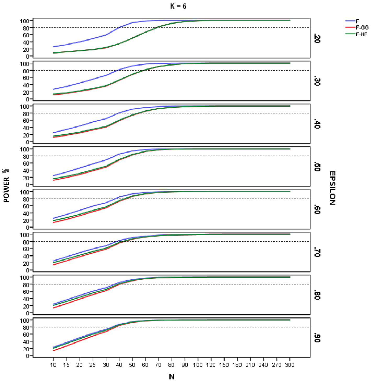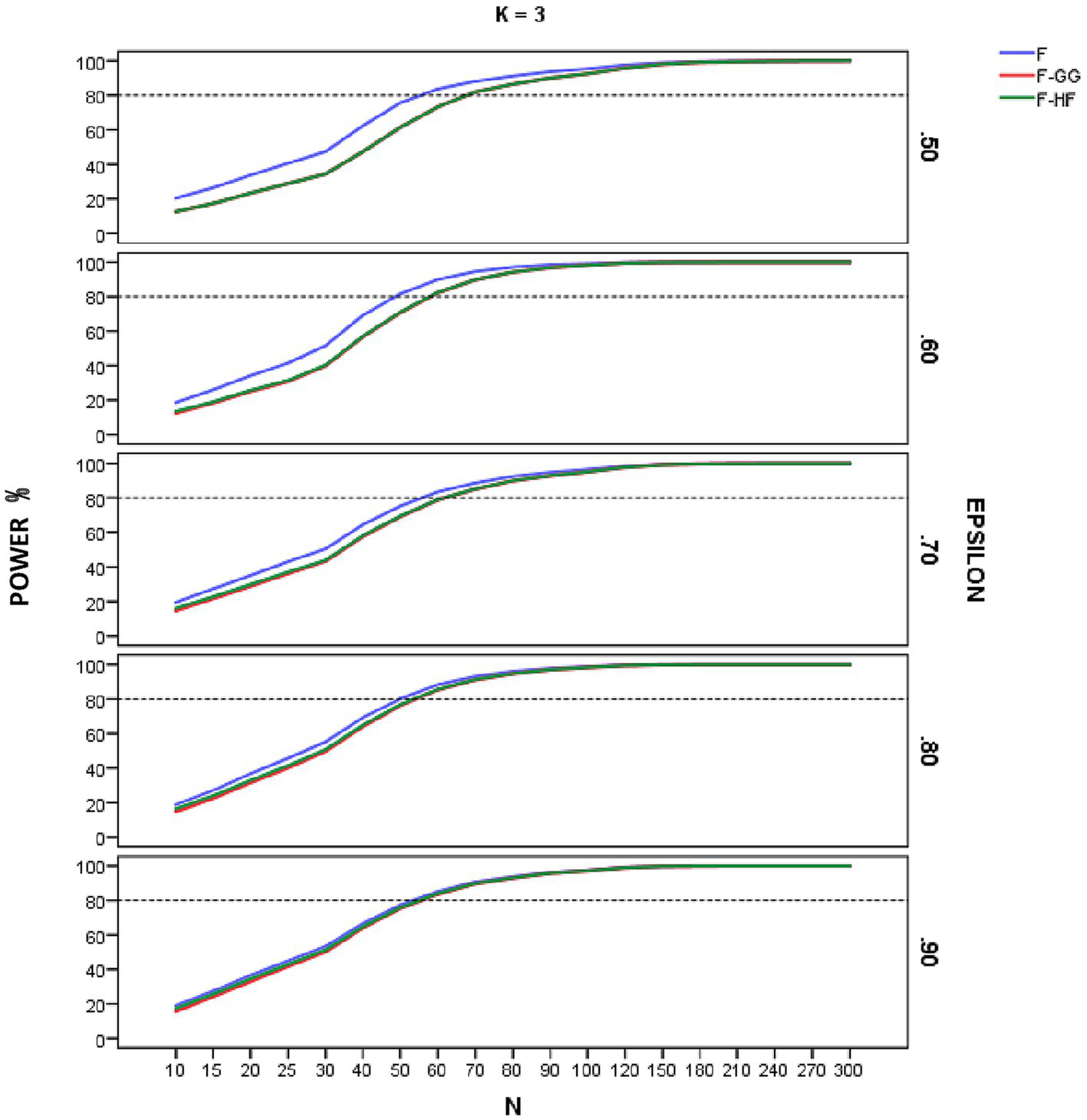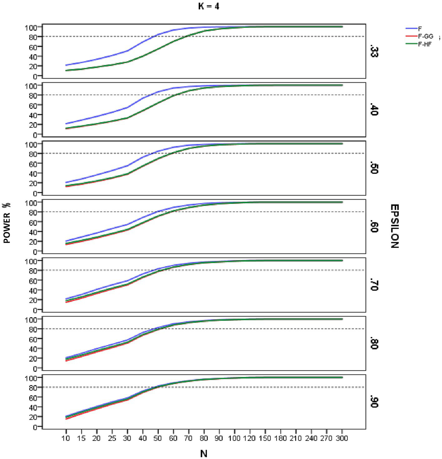 Finally, regarding power, the results show that as the value of decreases, a large sample size is necessary for both F-GG and F-HF to produce an empirical power of 0.80 for a medium effect size, which is the conventional threshold suggested when sample size is estimated a priori (Kirk, 2013; Cooper and Garson, 2016). This a priori power analysis is recommended in order to optimize the resources to be used in research (Faul et al., 2007). The increasing of sample size, if possible, may also be a strategy to compensate for anticipated violations of sphericity.
