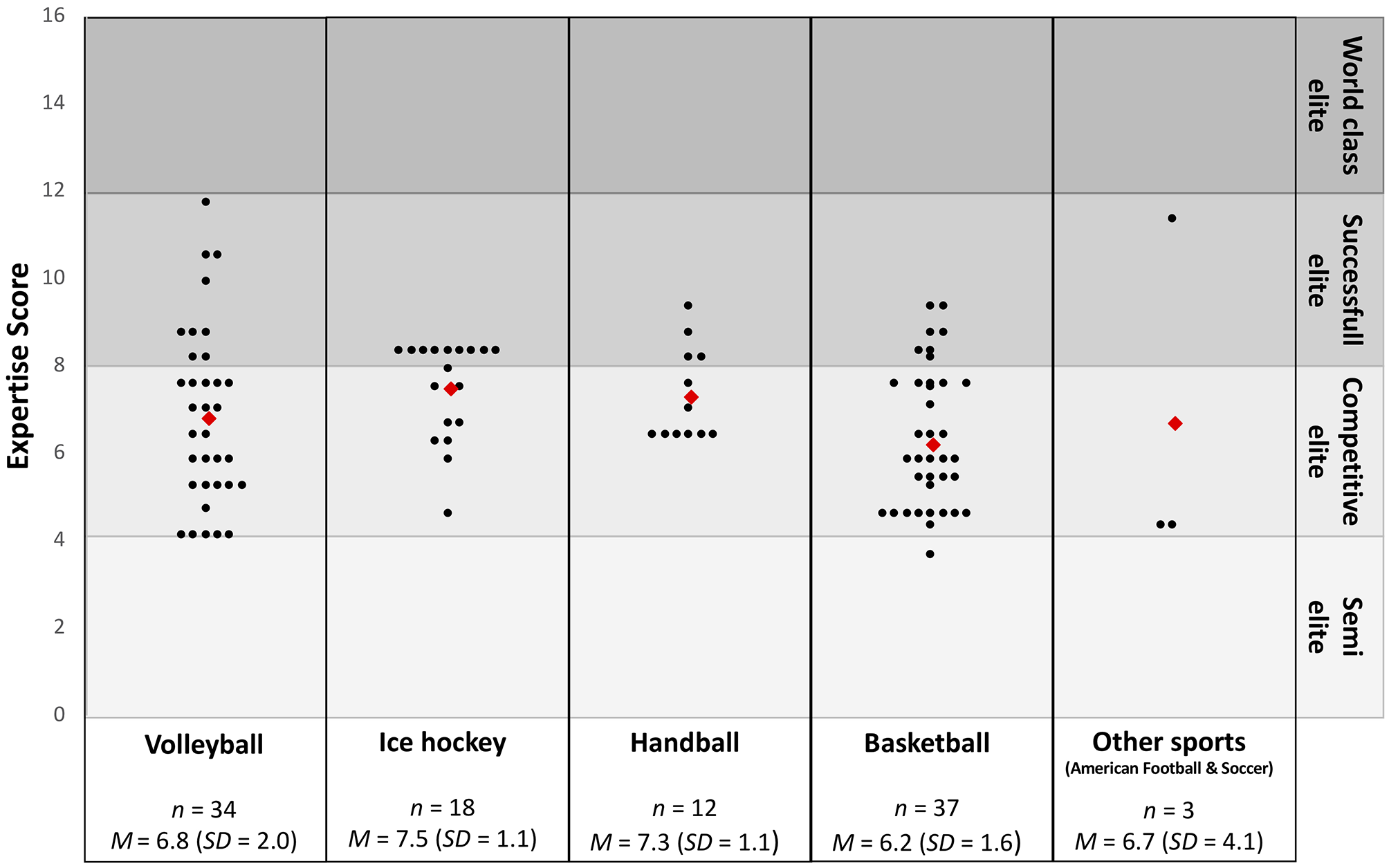 Figure 1. Expertise score in points for each participant (black circle) divided into type of sport (basketball, volleyball, ice hockey, handball) and other sports (American football and soccer) plus MExpertisescore (red square) of each type of sport. M, Mean; SD, Standard deviation.