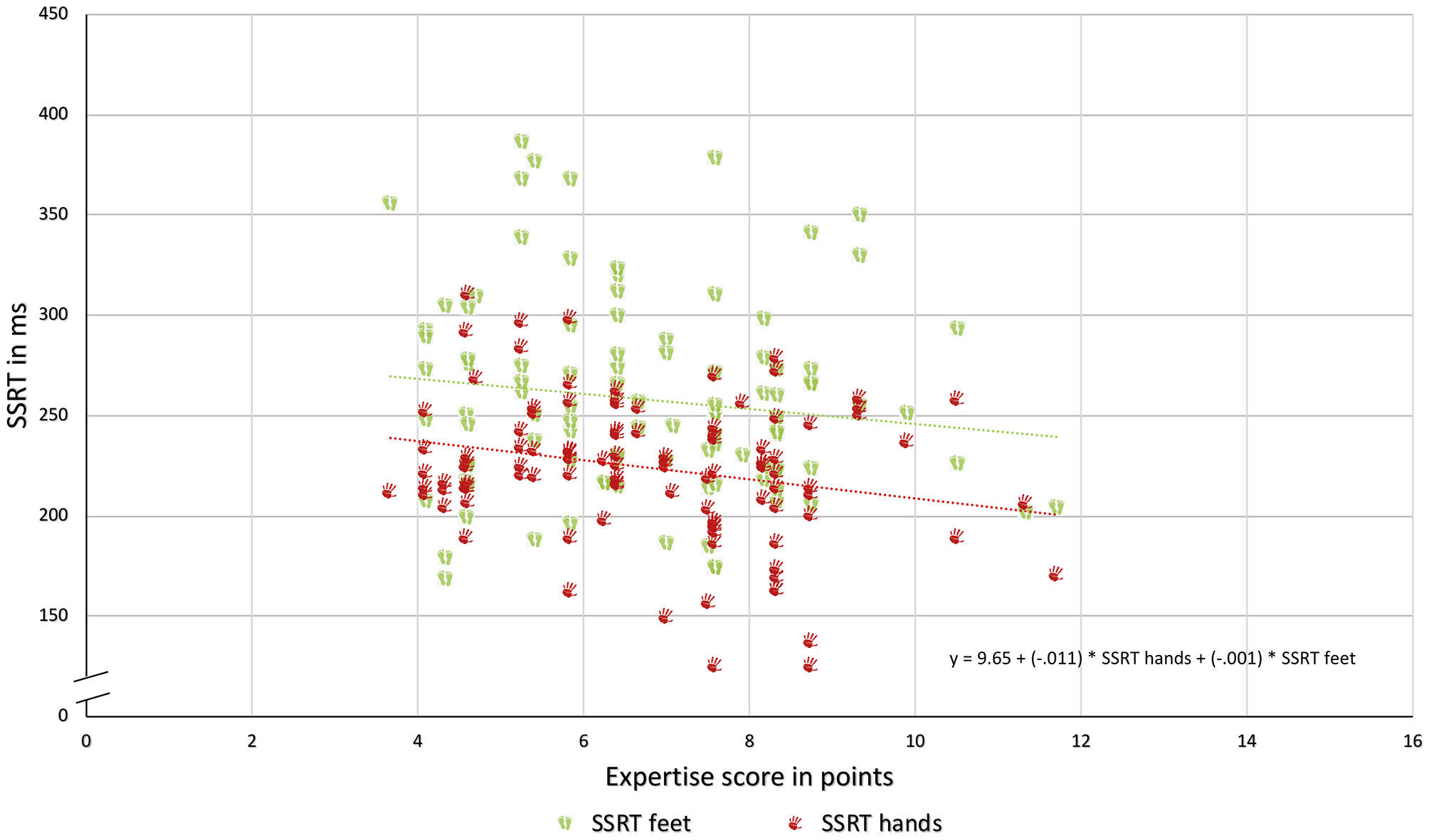 Figure 2. Relationship of expertise score (in points) and SSRTs (in ms) to hands (presented as a red hand) and feet (presented as green feet).