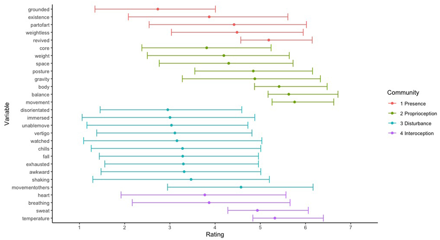 | 22 | My balance | Installation art often evokes direct and powerful corporeal relations by intervening with our balance or posture, e.g., via the use of uneven floor; Bishop (2005). Anecdotally, balance is an aspect of bodily experience noted by visitors of in orbit (e.g., Boehling, 2016; Hanz, 2019). |
