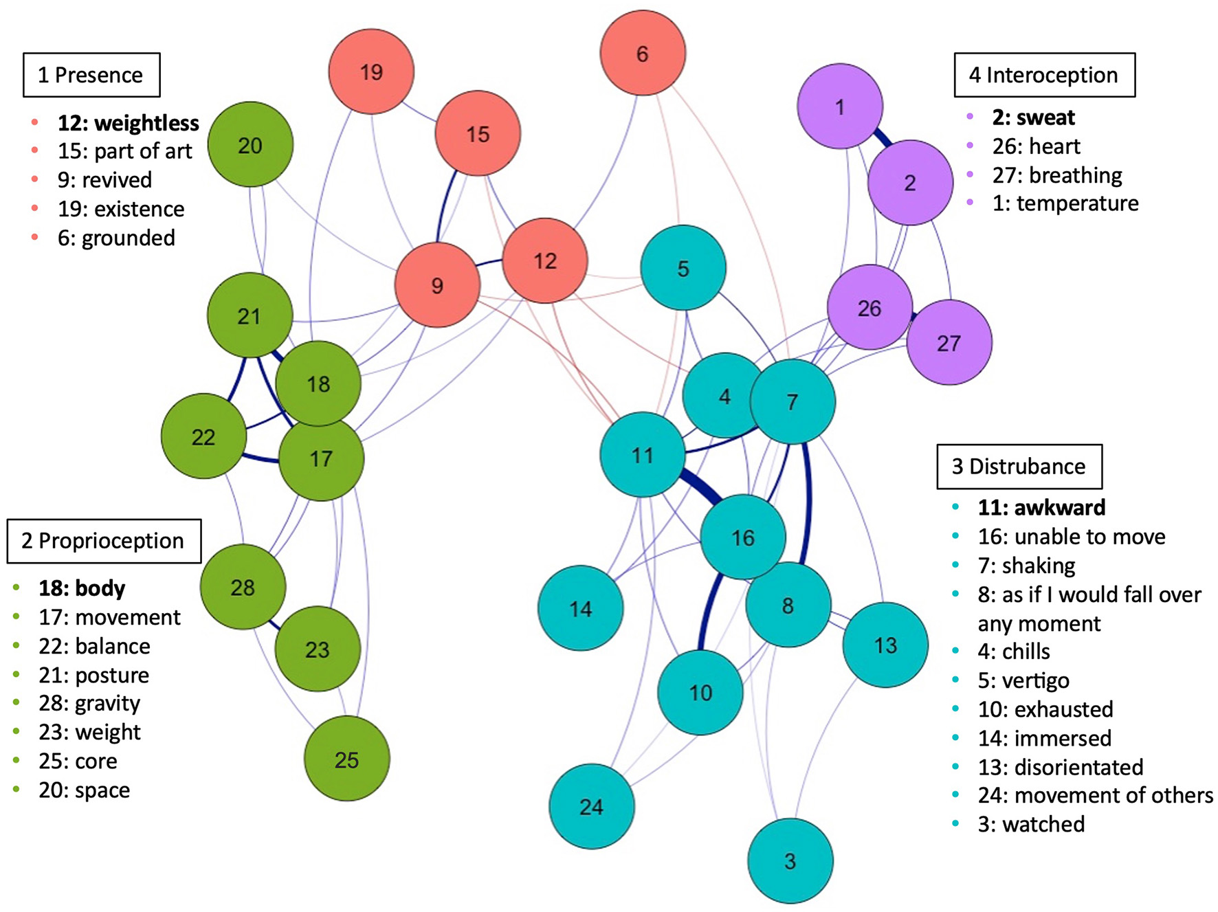 We also invited participants to reflect upon and report experiences related to their body (if any) via filling out an open text box. This assessment was placed before the body-item list to allow us to assess the spontaneous subjective reports independent of possible priming effects from our scale-based questions. We believe that it is important that some associative, qualitative analysis should complement the quantitative survey/network model. This provides us with more vivid, subjective reports that can be used to interpret the resulting network communities (i.e., how the experience in each community might have felt) and a bottom-up way to discover factors not anticipated in our review of relevant body-items.7 The qualitative data analysis was performed before the network analysis such that the researchers were not biased by it.