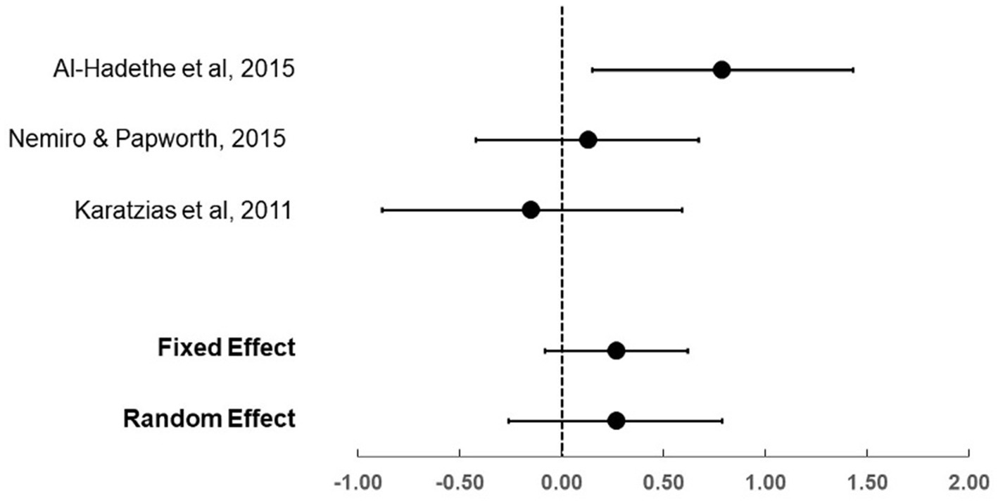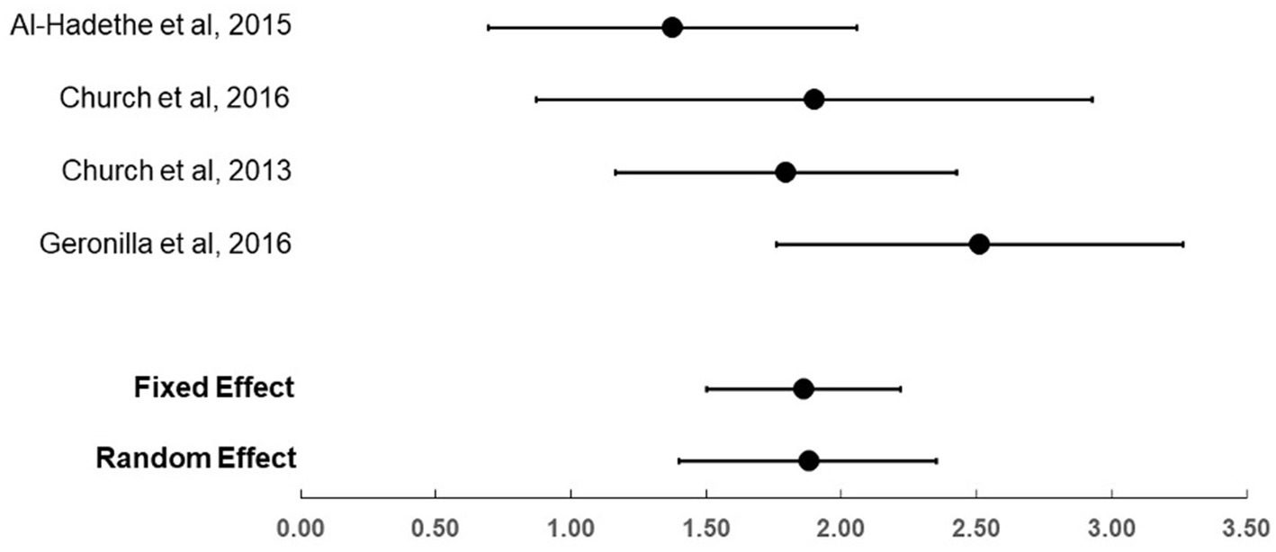 For the four trials that compared EFT (total n = 88) to no treatment controls (total n = 76), the effect sizes (Hedge’s g) were large, ranging from 1.38 to 2.51 (see Table 3; Figure 2). The fixed and random effect summary estimates were similar at 1.86 and 1.88, respectively, and both methods were highly statistically significant (p < 0.001). Heterogeneity of trial results was considered moderate, with an I2 value of 41.1. In the sensitivity analysis that removed the Al-Hadethe et al. (2015) trial, the fixed effect size was 2.06 (95% confidence interval: 1.62–2.49, p < 0.001).