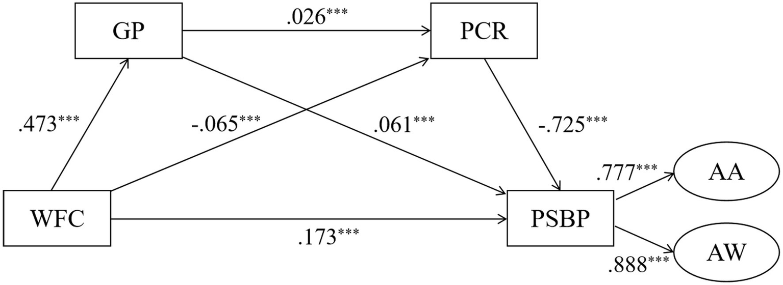 Many studies have demonstrated the existence of an indirect or mediated relationship between work-to-family conflict experiences and children’s well-being (Galambos et al., 1995; Crouter et al., 1999). According to mother-infant attachment theory (Bowlby, 1979), the parent–child relationships may be a significant mediating variable between work-to-family conflict and preschool children’s social behavior problems. Parent–child relationships is the earliest form of interpersonal relationships for children, which is formed in the process of interaction between parents and children (Driscoll and Pianta, 1992; Liang et al., 2022). Previous studies found that negative parent–child relationships in early childhood are an important risk factor for anxiety problems and play an important mediating role between the parents’ own characteristics, parenting behaviors, and early childhood development (Bradford et al., 2016). First,how parents balance their work and family roles is related to the quality of their parent–child relationships (Vieira et al., 2016). Second, a good nurturing relationship between parent and children shapes social, cognitive, and emotional development of children (Antonucci et al., 2004; Popov and Ilesanmi, 2015). Conversely, negative parent–child relationships are likely to increase preschool children’s social behavior problems. Negative parent–child relationships lead to less child supervision, more punitive discipline, and less child involvement; these can further lead to children’s antisocial behaviors (Johnston et al., 1998; Aucoin et al., 2006). Many studies have explored the influence of parent–child relationships on children’s social development in the Chinese cultural context. An example of relevant research is provided by Zhang et al. (2008), who found that early exposure to high-quality parent–child relationships can help reduce adjustment problems in children. In contrast, children who experience negative and conflicting relationships with their parents tend to exhibit more disruptive and aggressive behaviors (Lyons-Ruth, 1996). Generally, it can be reasonably postulated that work-to-family conflict may serve as a negative predictor of parent–child relationships, which, in turn, have an impact on the social behaviors of preschool children. Therefore, parent–child relationships act as a mediating variable between work-to-family conflict and the social behaviors of preschool children. This constitutes the research hypothesis 3 of the present study.