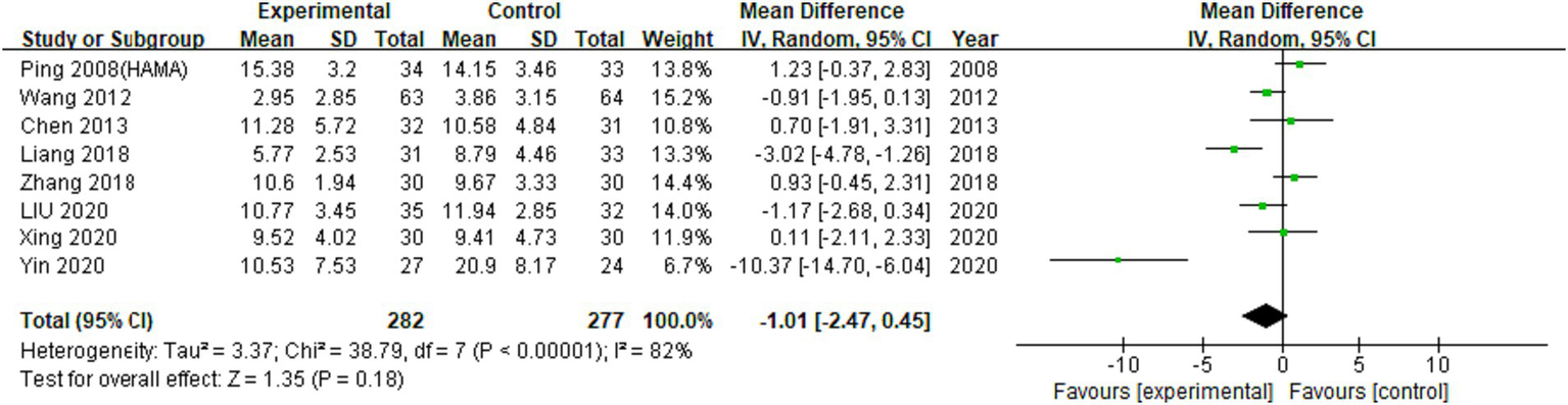 A total of 11 RCTs investigated the effect of EA on HAMA scores in our meta-analysis. Meta-analysis of 9 RCTs involving 9 trials with 609 participants were not statistically significant (MD: −1.13 (95% CI −2.55 to 0.29), I2:80%, Figure 4).