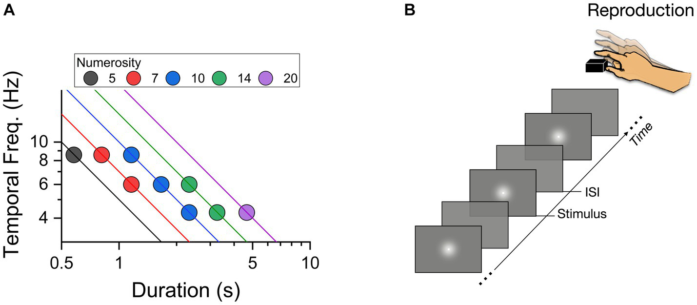 (A) Two-dimensional representation of stimulus space, plotting temporal frequency (Hz) of the sequences against total sequence duration (secs). The color-coding of the symbols gives their numerosity, with lines showing constant numerosity on this logarithmic plot. (B) Schematic representation of a trial with a sequence of flashes presented at variable ISIs (inter stimulus intervals).