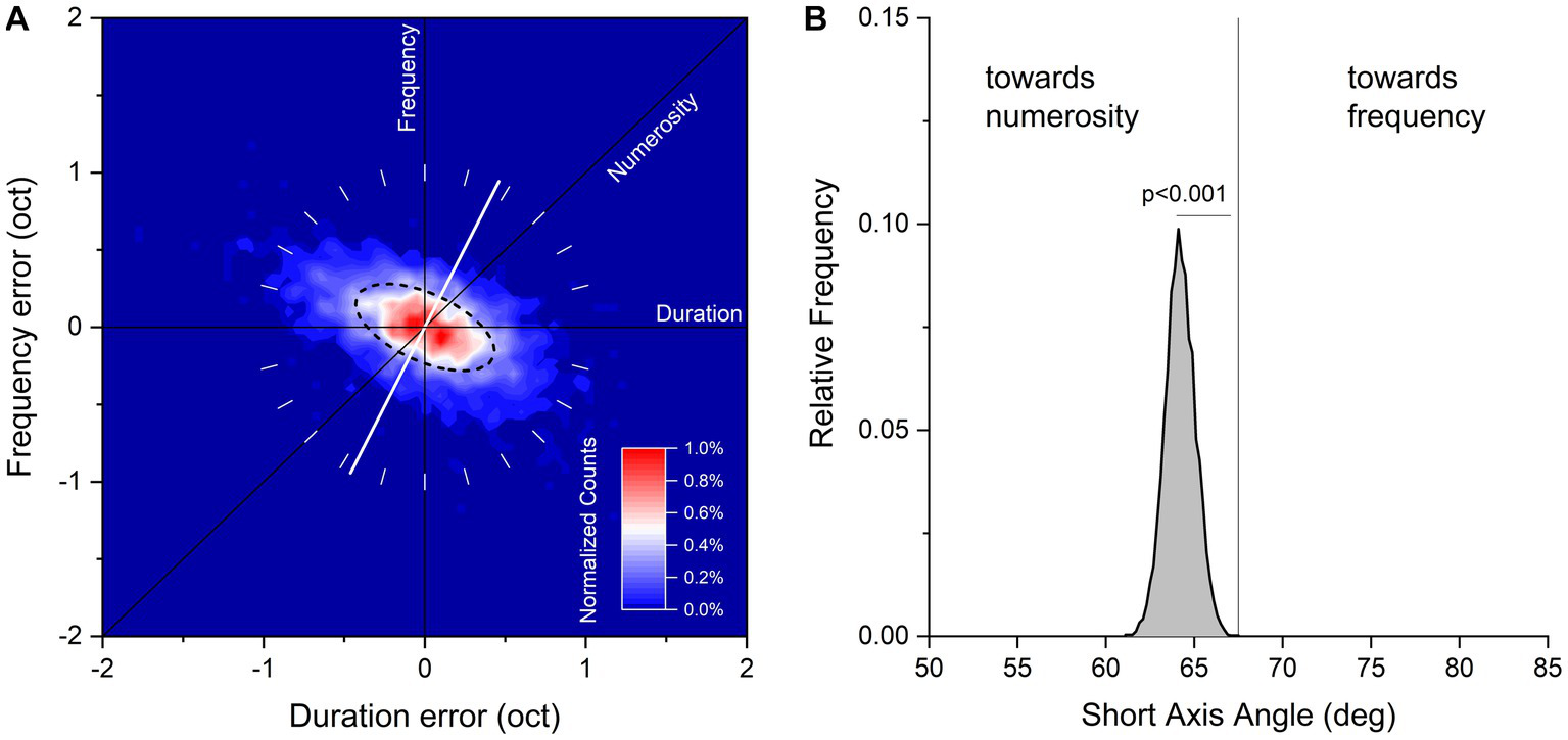 Figure 2. (A) Aggregate data showing normalized counts of errors in visual sequences reproduction on logarithmic plot of duration and temporal frequency. Data have been binned every 0.05 octaves and color maps normalized counts in a range from 0 to 1%. The black dashed line corresponds to half height of the fitted Gaussian ellipse fit to the data. The white tilted line runs through the orientation of the short axis of the fit (maximal sensitivity). (B) Bootstrap frequency distribution of short axis angle derived from aggregate data a 2D Gaussian fit.