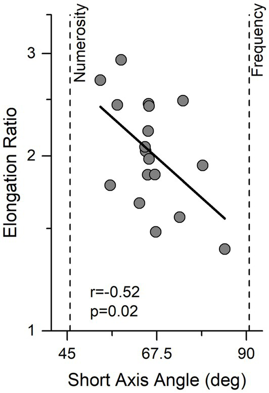 Interestingly elongation ratio correlated negatively with the direction of best sensitivity (short axis angle) (r = −0.52, p = 0.02) indicating that observers with better performance were those who relied more on the numerosity information.