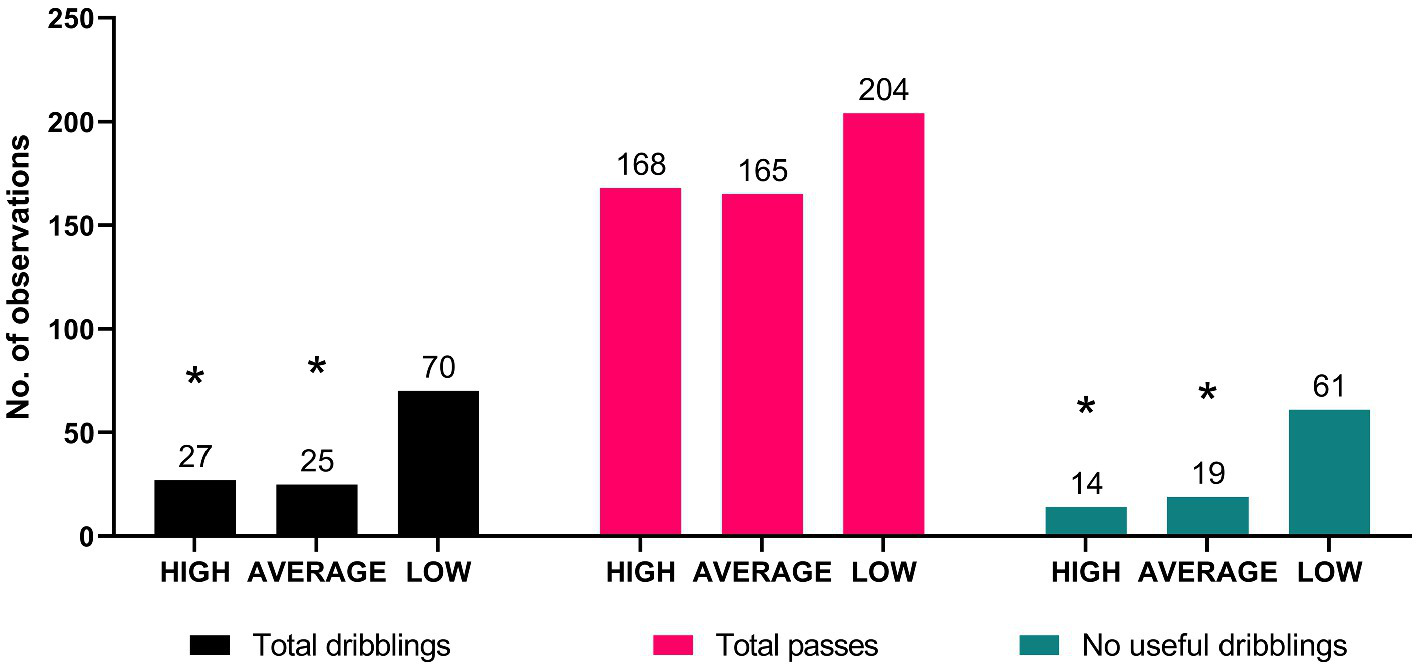 Associations between groups in total passes, dribbling, and no useful dribbling. HIGH – higher basic technical skills group; AVERAGE – average technical skills group; LOW – lower technical skills group; * significantly lower than LOW group at p < 0.001.