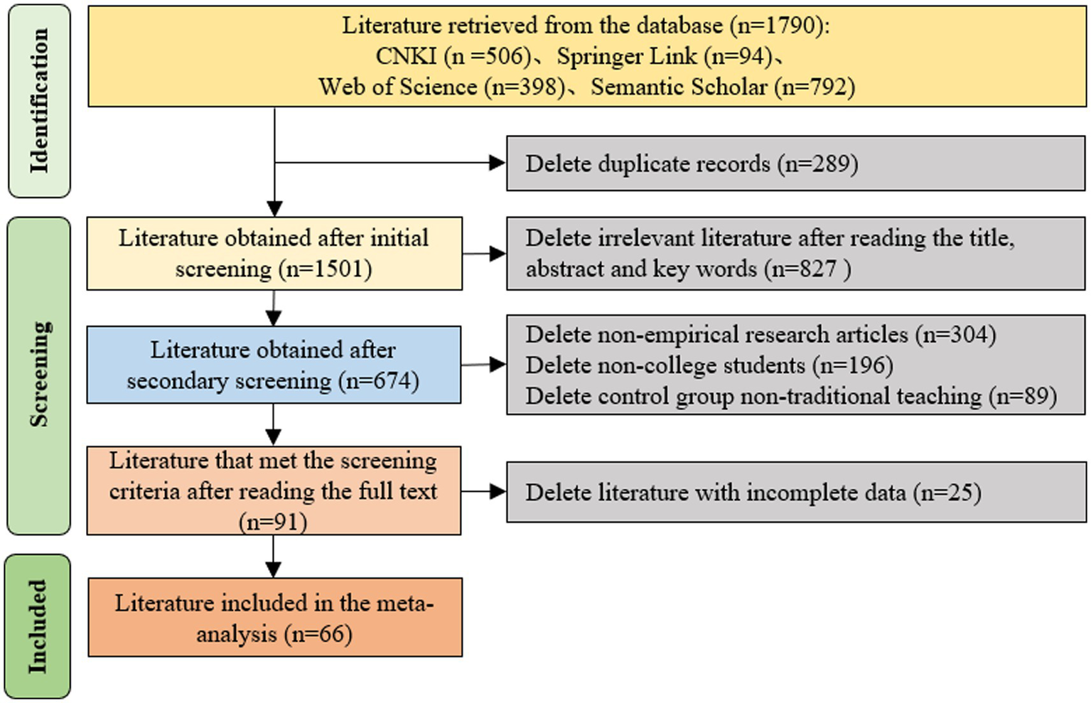 To find articles that meet the subject matter requirements, this study used the (Page, 2021) process for literature processing (Vrabel, 2009), the literature search, screening, and inclusion process is shown in Figure 2. Combining the needs of the meta-analysis method itself and ensuring the accuracy and rigor of the research results, the following selection and inclusion criteria were used: (1) duplicate literature had to be removed; (2) it had to be a study of the effects of project-based learning versus traditional teaching models on learning effectiveness; (3) it had to be an empirical research type article; (4) complete data that could calculate the effect values had to be available. A total of 91 articles were screened by two researchers in the inclusion phase, and those with inconsistent screening were discussed, and the final decision was made to include 66 articles in the meta-analysis, which met the inclusion criteria for the number of articles in the meta-analysis method.