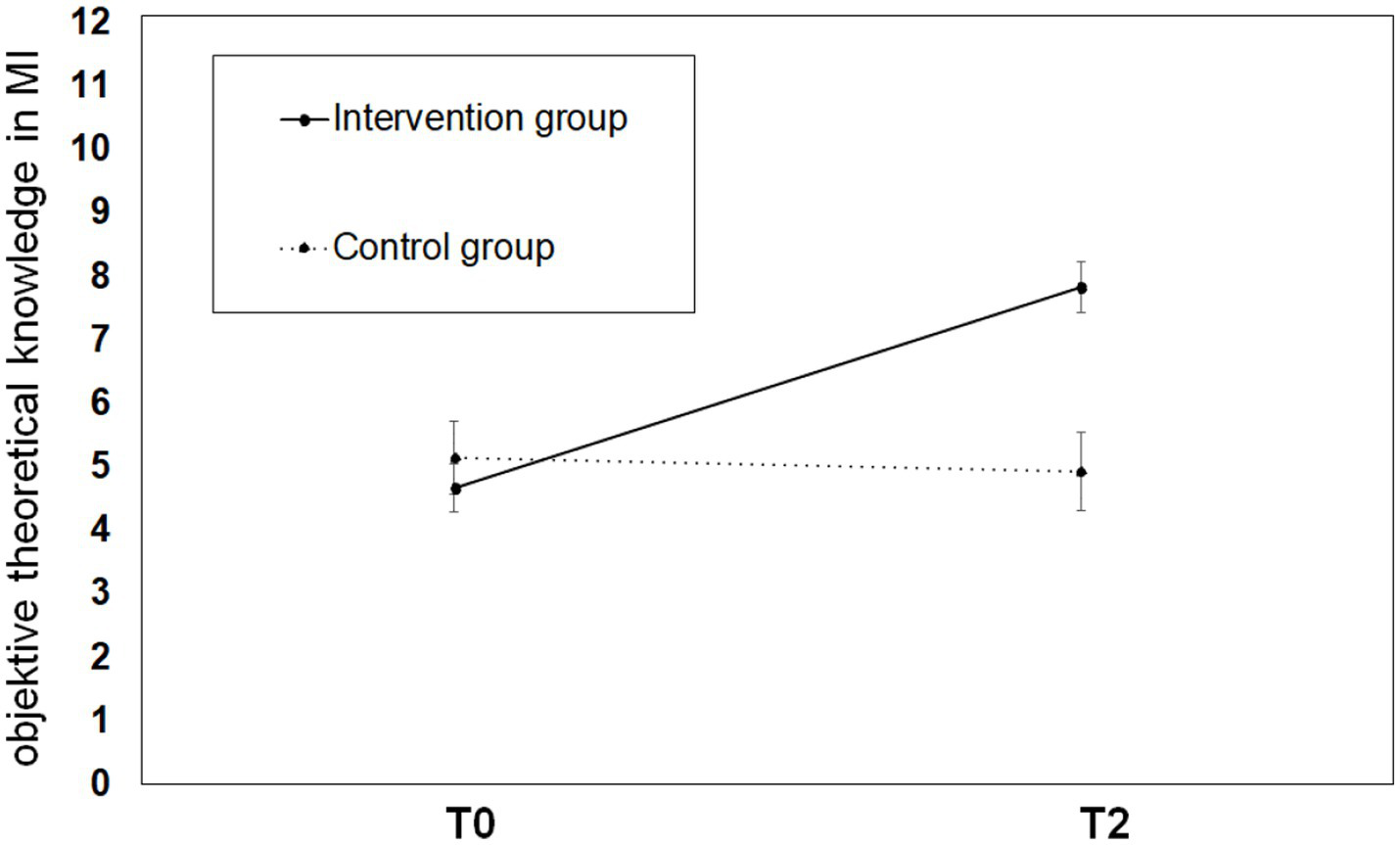 SPSS for Windows (version 22.0) was used for quantitative analysis. Data were analyzed visually and by Kolmogorov–Smirnov test under the assumption of normal distribution. However, if a non-normal distribution was suspected, non-parametric Mann–Whitney U test was also used. Homogeneity of variance was tested using Levene’s test. Descriptive statistics of participants between the two groups were tested for differences in means and distributions using t-tests and chi-squared tests. Analyses of variance were calculated using T0 and T2 as within-subject factors and group (control vs. intervention) as a between-subject factor to examine the impact of the MI curriculum. The Mann–Whitney U test was used to test for homogeneity of variance. Partial eta squared (η2) was used as the effect size for ANOVA and Pearson’s correlation coefficient r for t-tests. Correlations were calculated using Pearson’s correlation coefficient r, Spearman’s correlation coefficient rs or Kendall’s correlation coefficient τ depending on the scale level. At the nominal scale level, possible correlation was tested using Fisher’s exact chi-squared test and the non-parametric Mann–Whitney U test. p-values below 0.05 were considered significant.
