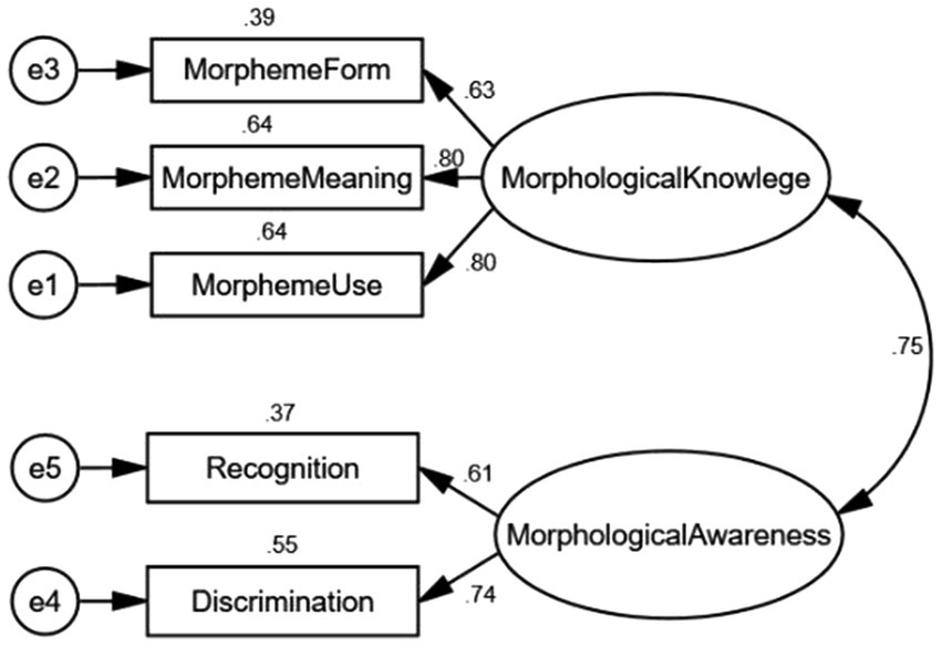 Two-factor confirmatory analysis of morphological knowledge and morphological awareness.