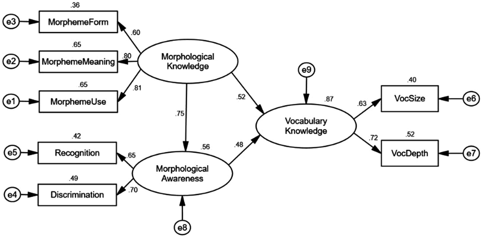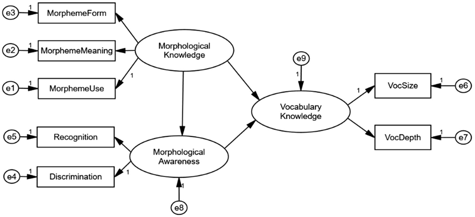 Taken together, morphological knowledge in present study was conceptualized as the implicit processing of principles of word formation as well as the knowledge of specific morphemes such as how they convey semantic and syntactic meaning whereas morphological awareness was conceptualized as the conscious awareness of word structures and the ability to reflect on and manipulate that structure. However, the tasks utilized to test these two constructs primarily drew on measures such as word analogy task, derivation and decomposition tasks which were well-acknowledged in the assessment of morphological awareness or morphological knowledge. In addition to studies exploring morpheme acquisition (Carlisle, 2000; Nagy et al., 2014), few studies have examined morphological knowledge/or morphological awareness with specific knowledge of morphemes (prefixes and suffixes) and its effect on vocabulary. The current study was designed to verify whether morphological knowledge and morphological awareness were two separate constructs when the knowledge of specific morphemes of prefixes and suffixes were included in the measurement tasks, which was not touched on in prior literature. Meanwhile, regarding the methodological limitations in previous studies, measurement errors underestimated the magnitude of mediated effect and overestimated the strength of the direct effect (Hoyle and Kenny, 1999). In order to improve the accuracy of mediated effect measurement, the latent variable models which are specified as the true measure of construct (MacKinnon, 2008) are used in present study aiming to delve into the underlying mechanism between latent variables in structural modeling analysis.