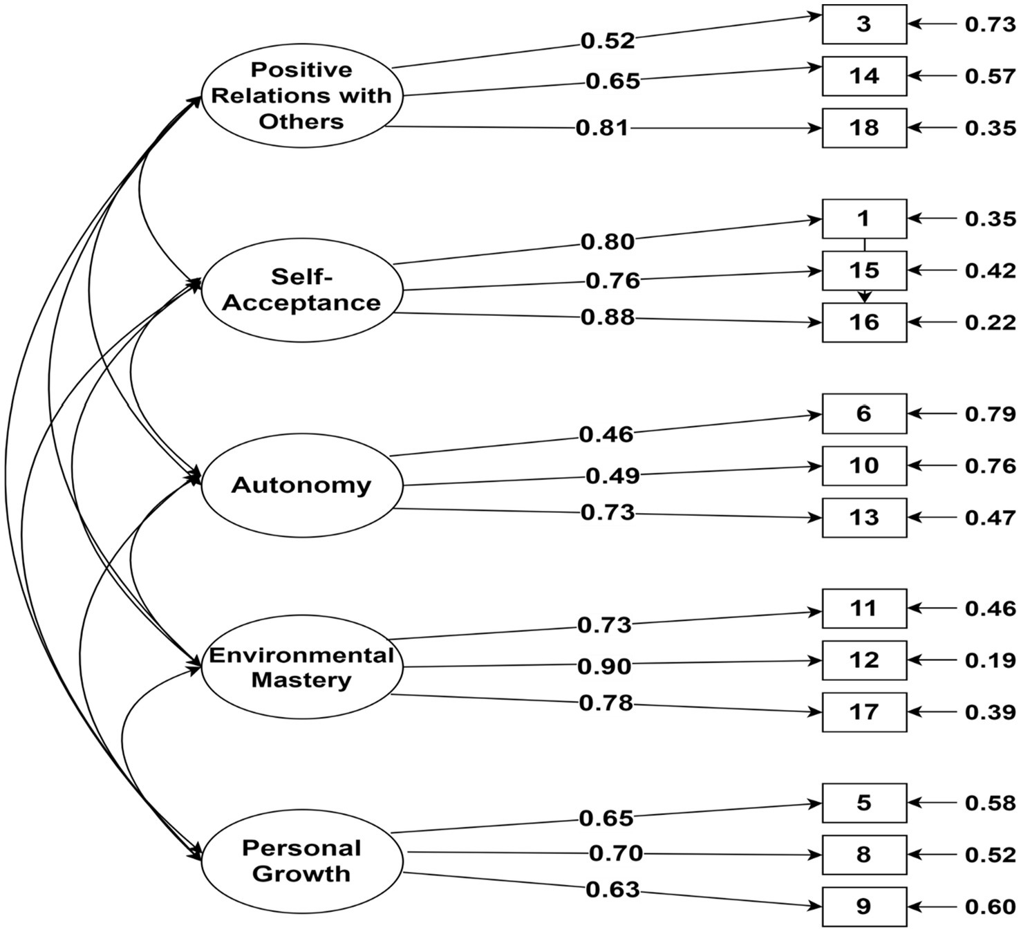 PR, positive relations with others; EM, environmental mastery; SA, self-acceptance; A, autonomy; PG, personal growth; and PiL, purpose in life.