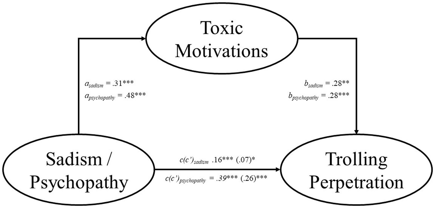 Toxic anonymous motivations partially mediate the relationship between sadism/psychopathy and trolling perpetration. We report the standardized coefficients for all variables. Each model included Machiavellianism, narcissism, and either psychopathy or sadism as covariates. The numbers in the brackets indicate the direct effect of each model. *p < 0.05, **p < 0.01, ***p < 0.001.