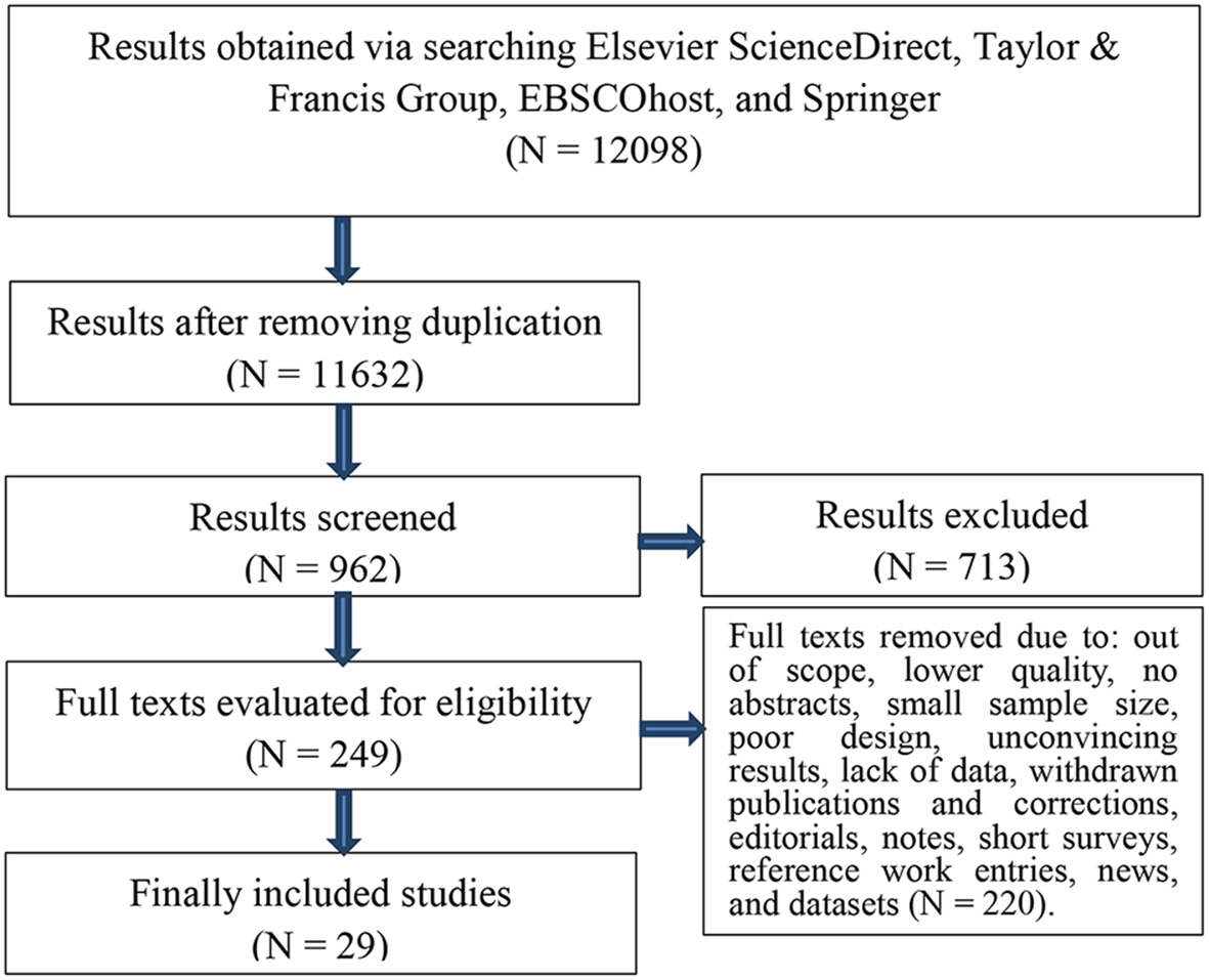 Based on the PRISMA flow (Figure 1), we conducted the inclusion and exclusion process. To maximize the number of data included, we searched the databases from their inception until February 26, 2023 without time limitation. We entered keywords and index terms, e.g., blended learning, performance, attitude, achievements, and engagement, different countries, into different databases according to their specific syntactical rules. We obtained 12,098 results by searching four online databases, i.e., Elsevier ScienceDirect, Taylor and Francis Group, EBSCOhost, and Springer. Then we entered the results into ENDNOTE X8 (Thomson Reuters, New York, USA) to remove those duplicated. Then we invited two researchers to double-check whether or not the results are related to the study by screening the titles and abstracts. After this, they conducted the evaluation of eligibility of the results.