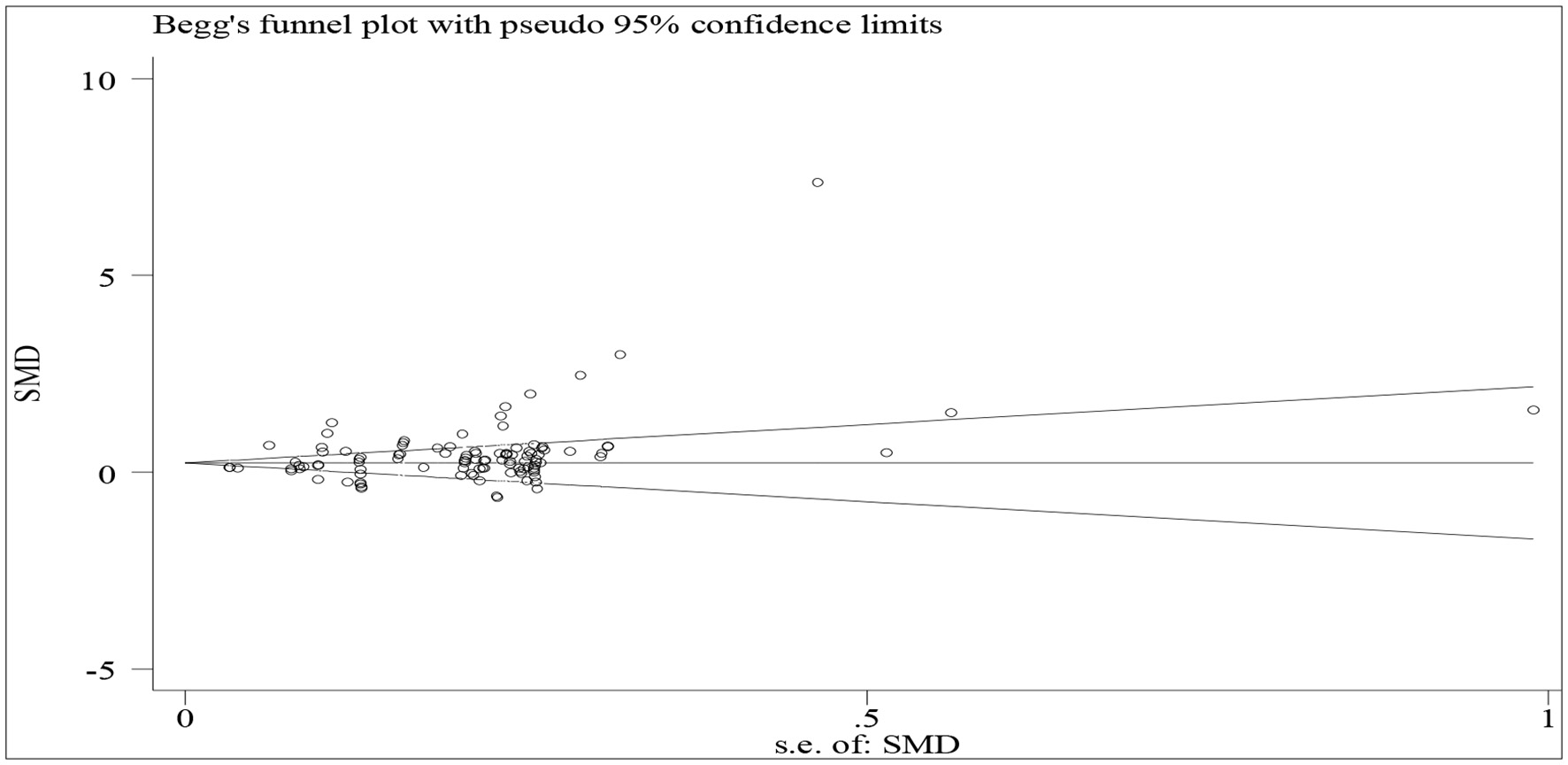 To test the publication bias, we firstly entered data, e.g., means, standard deviation, and numbers of participants across both groups, into Stata/MP 14.0 to run the meta-analysis. Then, we obtained effect sizes (ES) and standard errors of effect sizes (seES) for the test of publication bias. We tested the publication bias by entering “ES, seES” into Stata/MP 14.0, leading to a funnel plot (Figure 2) and related data. A dot indicates an individual study, and the middle line is the no-effect line. If the dots are symmetrically distributed along both sides of the no-effect line, there will be an absence of publication bias. On the contrary, the asymmetrical distribution indicates the presence of publication bias. As shown in Figure 2, it is hard to conclude that the dots are symmetrically distributed, indicating the presence of publication bias. Both Begg's (Q = 1016, S.D. = 381.89, z = 2.66, p = 0.008) and Egger's tests (Coefficient = 1.55, S.E. = 0.48, t = 3.25, p = 0.002, 95% CI = 0.60~2.48) also indicate the presence of publication bias.