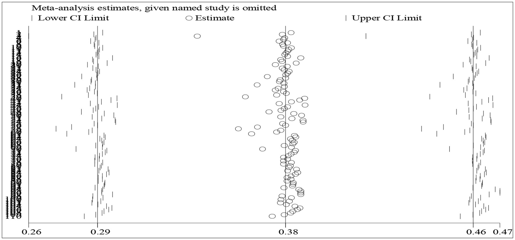 We conducted a sensitivity analysis to test the reliability and stability of the obtained effect sizes using the program “metan-based influence analysis”. To retrieve the result, we entered the data such as means, standard deviations, and numbers of both groups into Stata/MP 14.0. We adopted a random-effect model to conduct the sensitivity analysis due to the high degree of percentage of variability caused by heterogeneity (Q = 1053.01, I2 = 89.7%, z = 8.88, p < 0.01).
