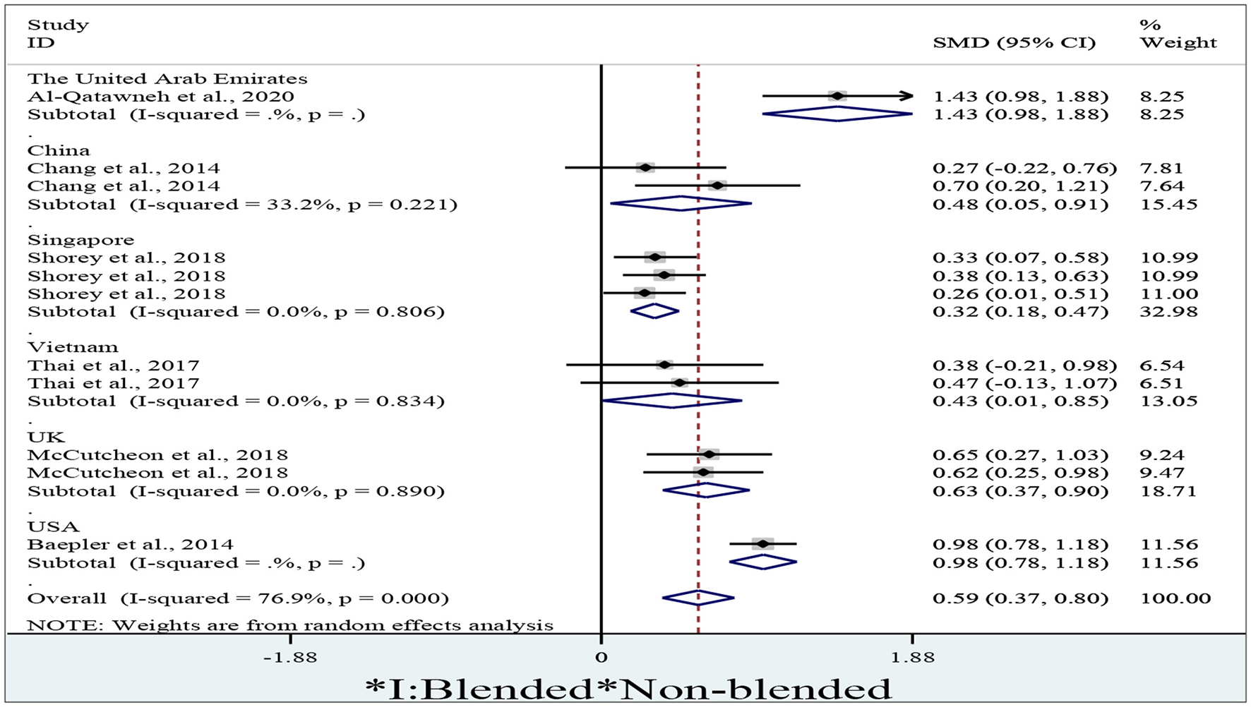 To determine student performance in blended and non-blended learning modes in different countries, we retrieved 27 effect sizes from different countries, where 18 effect sizes sourced from China, 8 from the USA, and 1 from Vietnam. We failed to obtain an effect size from a study (Yang et al., 2013) because one of the standard deviation values is zero. We obtained meta-analytical data and a forest plot (Figure 4) after entering means, standard deviations and, numbers across both groups into Stata/MP 14.0 to run the meta-analysis by the variable country.