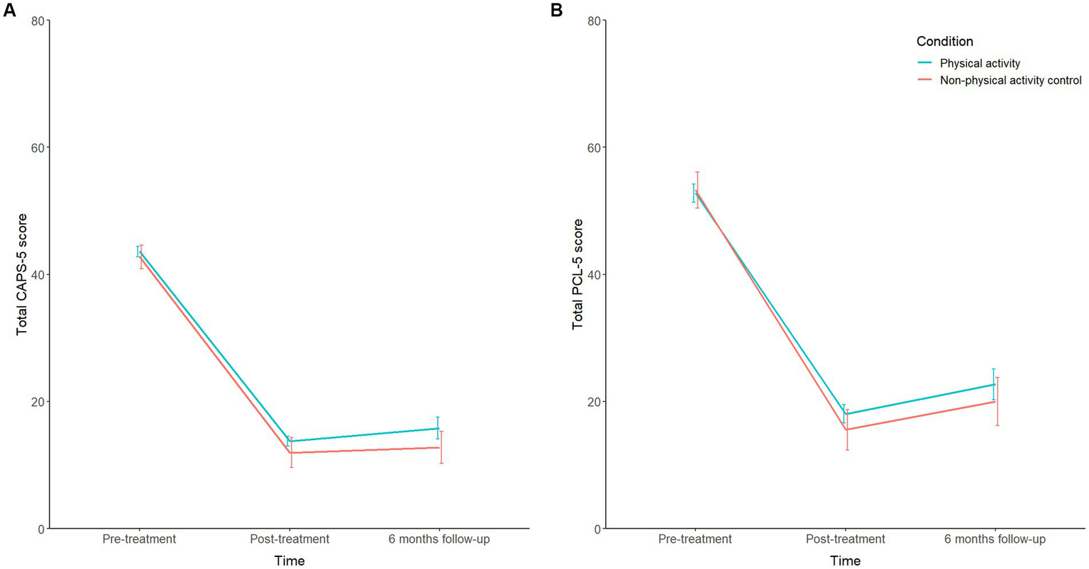 Reference group (intercept): physical activity condition at pre-treatment.Note. CAPS, Clinician-Administered PTSD Scale; PCL-5, PTSD Checklist for DSM-5.