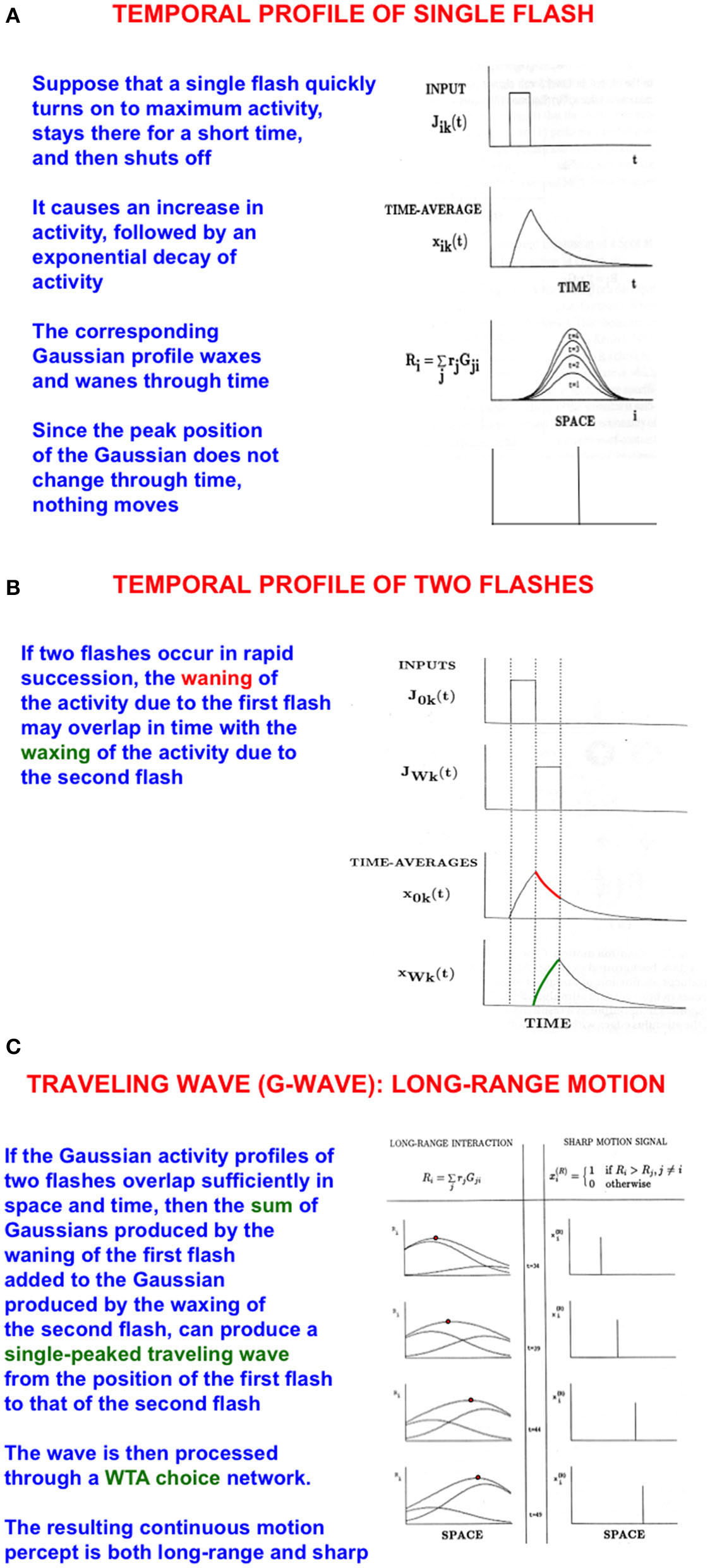 Long-range apparent motion: (A) As a flash waxes and wanes through time, so too do the activities of the cells in its Gaussian receptive field. Because the maximum of each Gaussian occurs at the same position, nothing is perceived to move. (B) If two flashes occur in succession, then the cell activation that is caused by the first one can be waning while the activation due to the second one is waxing. (C) The sum of the waning Gaussian activity profile due to the first flash and the waxing Gaussian activity profile due to the second flash has a maximum that moves like a traveling wave from the first to the second flash [Adapted with permission from Grossberg (2021)].