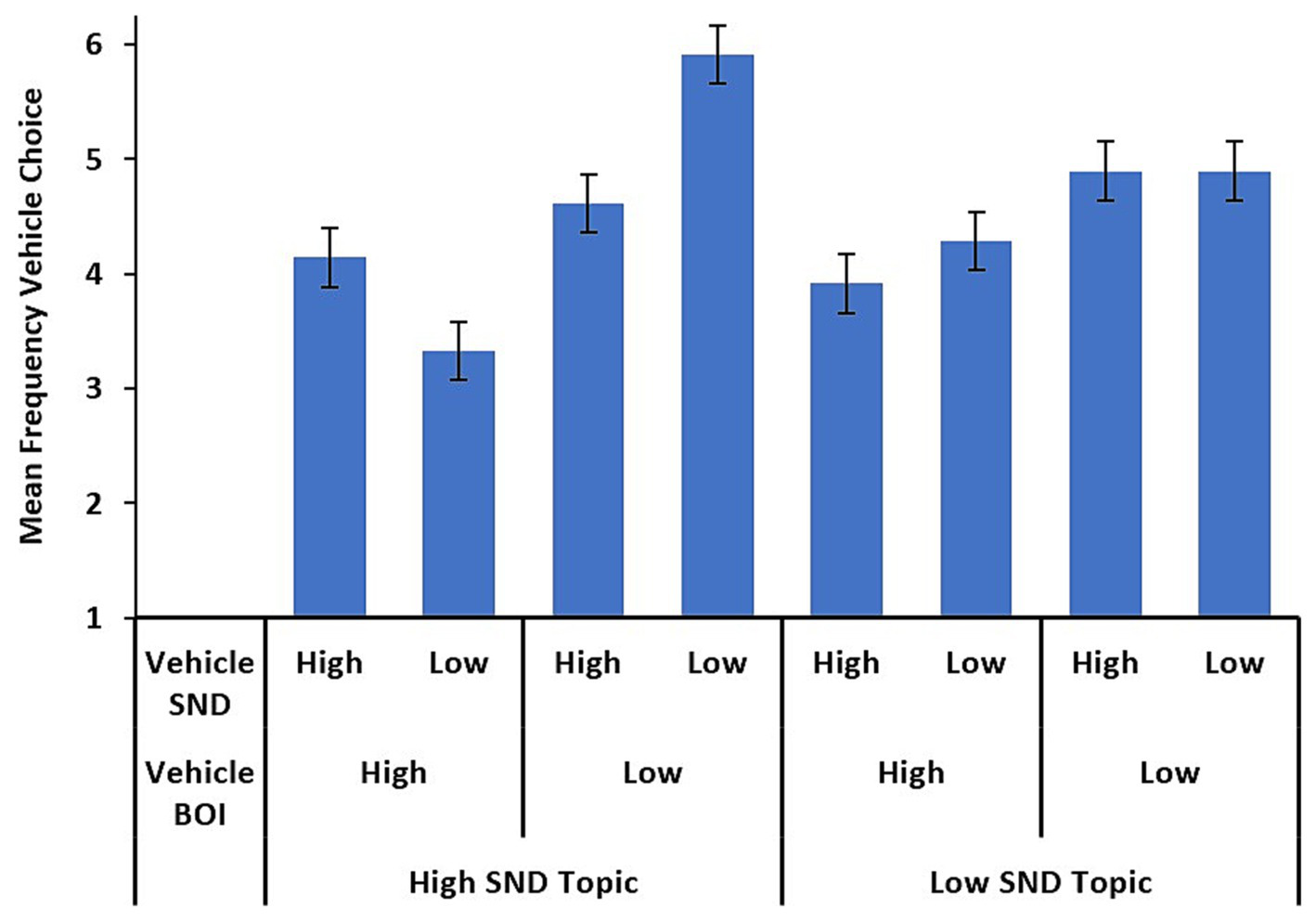 Condition means across levels of topic SND and vehicle SND and BOI. Error bars represent standard error.