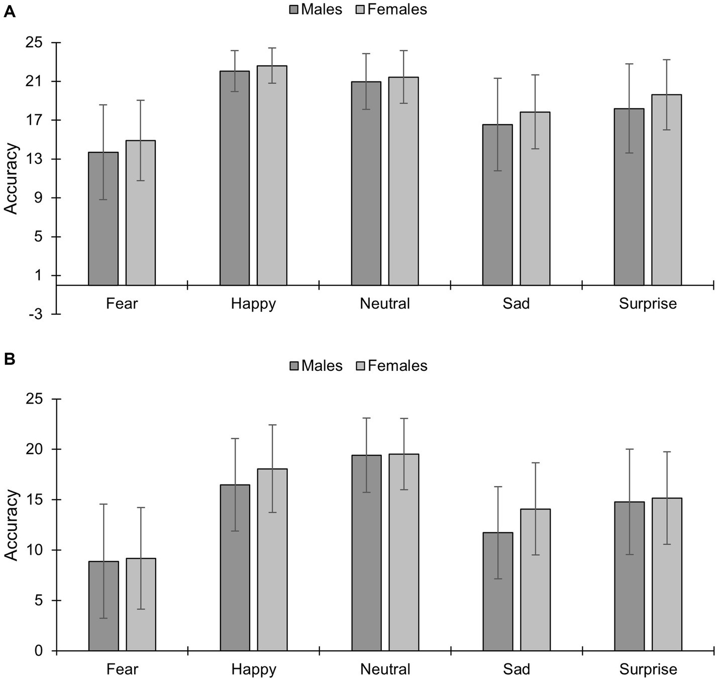 Accuracy to different facial expressions of emotion under (A) unmasked and (B) masked conditions in males and females (mean and standard deviations are presented). *p < 0.05; **p < 0.01; ***p < 0.001. The maximum accuracy score is 24 per emotion.