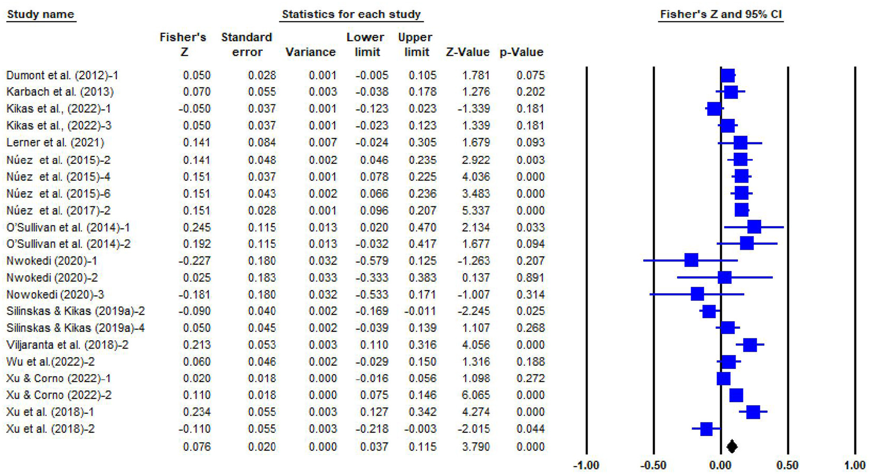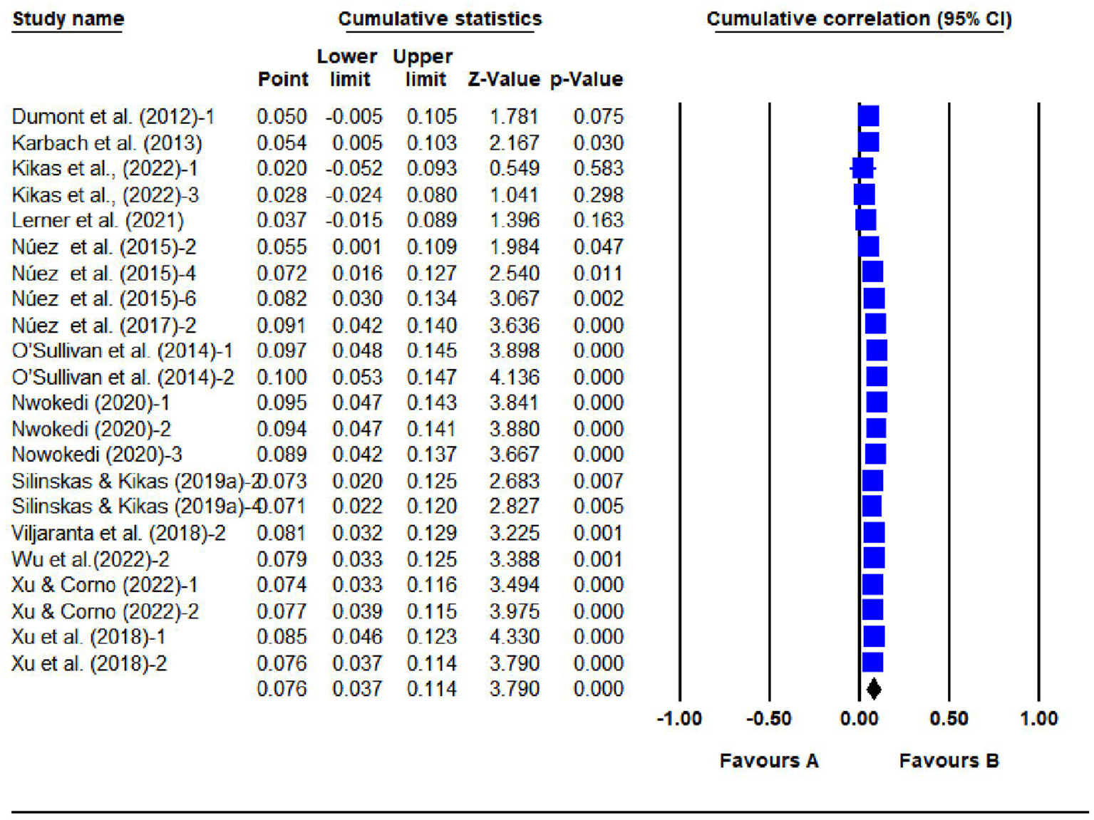 Methods: Accessed through Web of Science, Taylor and Francis Online, EBSCO, Springer Link, Elsevier, and ProQuest databases, a total of 20 empirical studies between 2005 to 2022, 41 independent effect sizes were included (N = 16,338). Effect size estimations were obtained by transforming Fisher's correlation coefficient. This study has conducted the heterogeneity tests of the magnitudes grouped according to different moderators, and investigated the publication bias that affects meta-analysis studies.