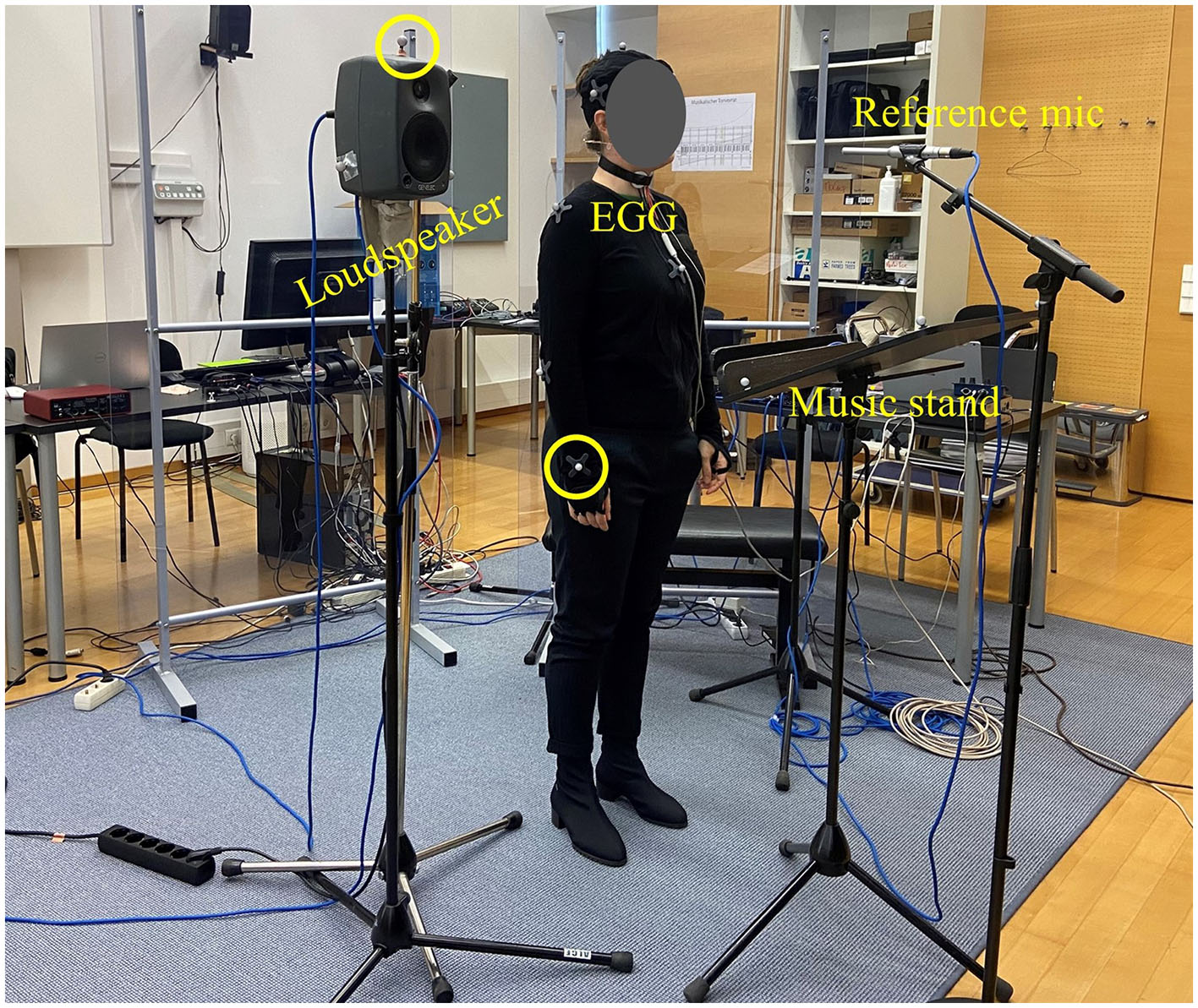 Example of the experimental set-up, showing some of the motion capture markers placed on the singer's right wrist and the loudspeaker (circled). The figure also displays the electroglottography (EGG) electrodes on the singer's neck as well as the reference microphone and the music stand placed in front of the singer.