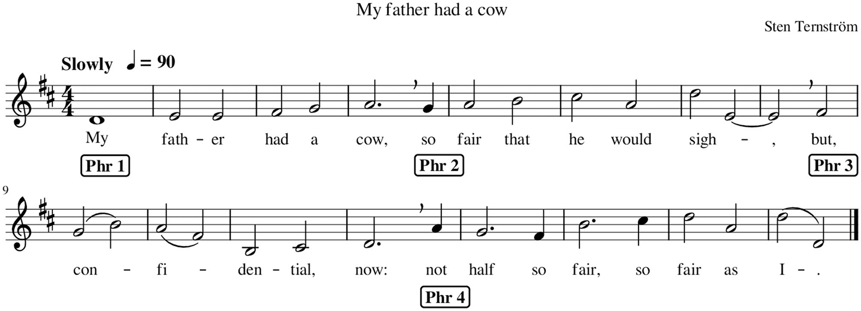 A short 16-bar piece (as shown in Figure 2) was composed for the study by the second author (ST), such that the piece was simple enough to be learned quickly and could function as a two-part canon at two bars offset. Many long sustained notes were employed in the piece, to facilitate intonation stability throughout. The lyrics, in English, were written to contain many open vowels and few sequences of multiple consonants. None of the participants had any difficulties with pronunciation.