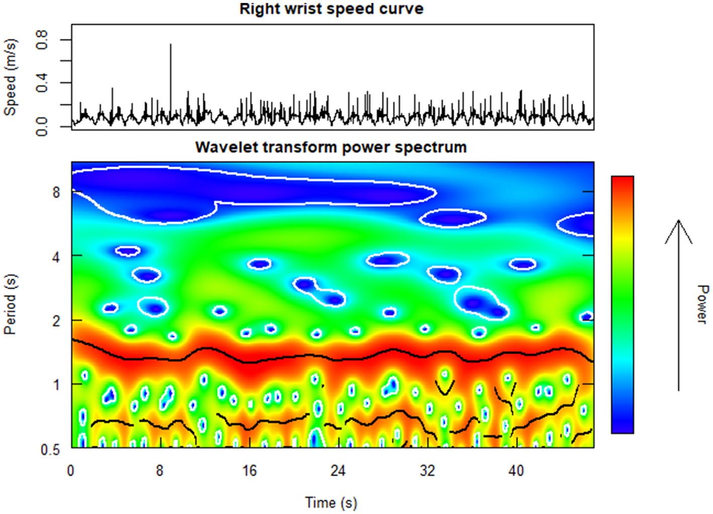 Example heat plot of the wavelet transform (WT) power spectrum (at the bottom) as computed from the right wrist speed curve (at the top) for a chorister performing the short tune in unison along with a pre-recorded performance of the same piece. The warmer the map, the more periodic the signal is.