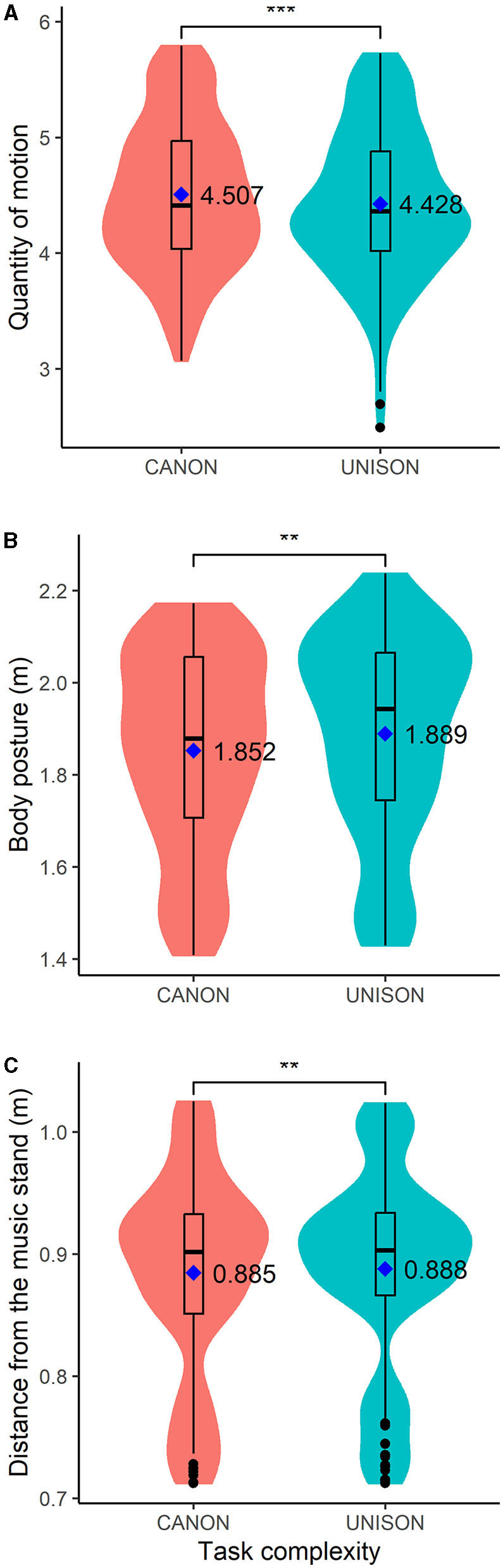 Then, the total quantity of motion (QoM) was calculated as the sum per second of the Euclidean norm of 3D velocity values across all markers for each singer and repeated performance. Then, the QoM was averaged across time stamps within phrases. This step produced four QoM values (one per phrase) for each singer and repeated performance. Because QoM data were not normally distributed, they were log-transformed before the analysis.